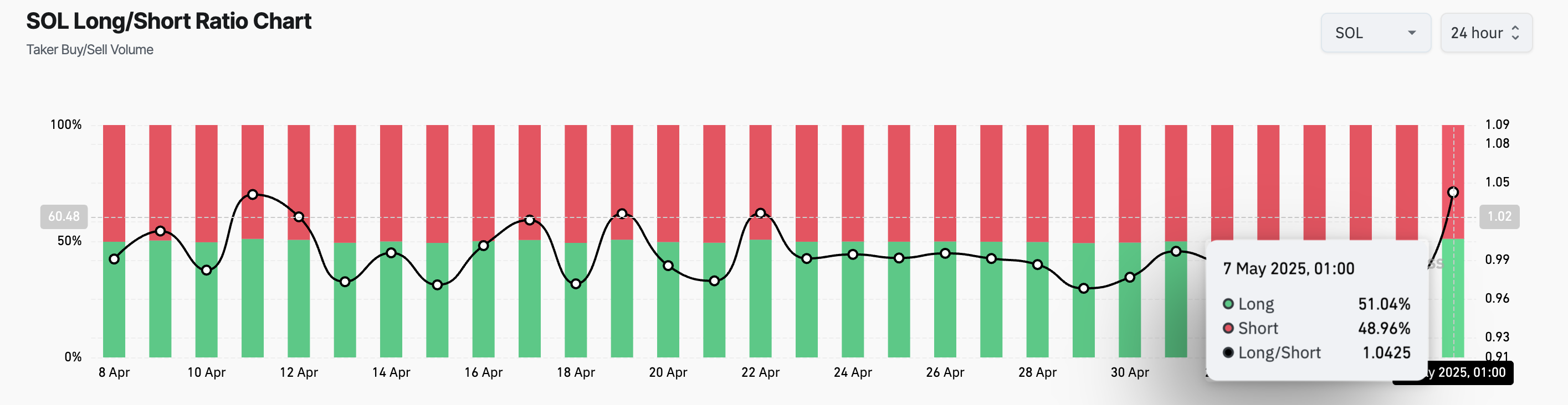 Фьючерсные трейдеры SOL выразили оптимизм, увеличив спрос на длинные позиции. По данным Coinglass, соотношение длинных (бычьих) и коротких (медвежьих) позиций достигло месячного максимума 1,04. Значение выше единицы свидетельствует о том, что участники фьючерсного рынка предпочитают длинные позиции и ставят на рост цены.