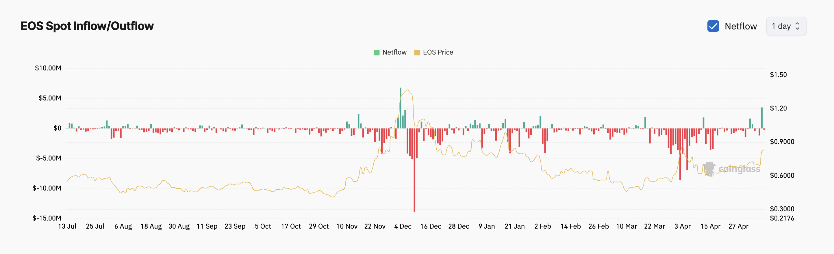В среду Vaulta сообщила, что EOS будет переименован в A, с обменом токенов 1:1 в рамках трансформации проекта. Эта новость вызвала новый интерес инвесторов, что привело к резкому увеличению притока EOS на спотовые рынки в среду. По данным Coinglass, приток составил $3,49 млн, что стало самым высоким однодневным показателем с третьего декабря.