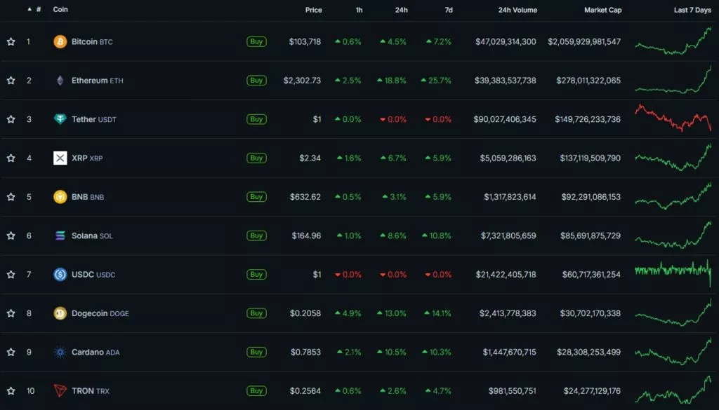 За последние 24 часа котировки Ethereum выросли на 18,8%, до отметок выше $2300. Биткоин уверенно закрепился над $103 000.