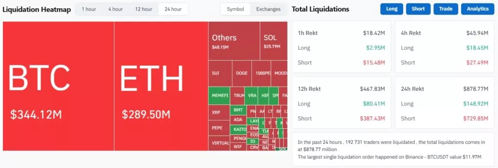 Объем ликвидаций за сутки составил почти $880 млн. Из общего показателя $344 млн пришлось на биткоин, $289 млн — на Ethereum.