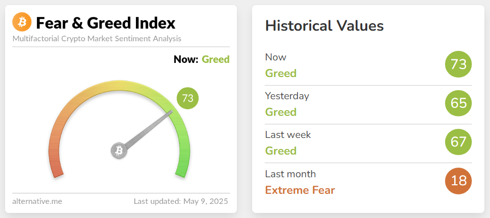 Между тем еще один важный показатель — индекс страха и жадности криптовалют. Он достиг 73, войдя в зону «Жадности», что является самым высоким значением за последние два месяца. Это указывает на то, что настроения инвесторов меняются от осторожности к энтузиазму.