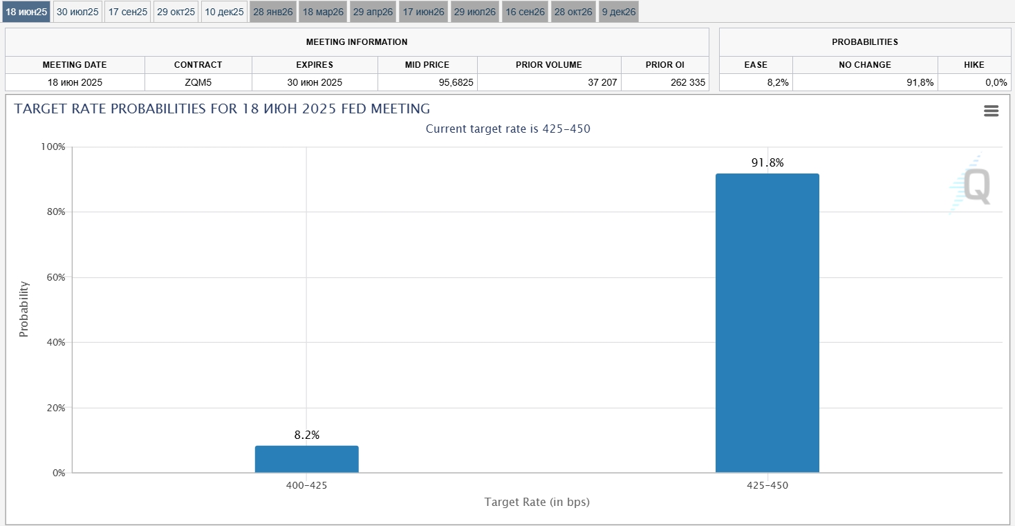 Участники рынка также не рассчитывают на скорое смягчение политики ФРС. По данным CME FedWatch, вероятность снижения ставки в июне на 25 п.п. составляет всего 8,2%. По информации издания, месяц назад она составляла 80%. Вероятность того, что ФРС не будет повышать ставку и в июле — 61,4%, месяцем ранее — всего 7%.