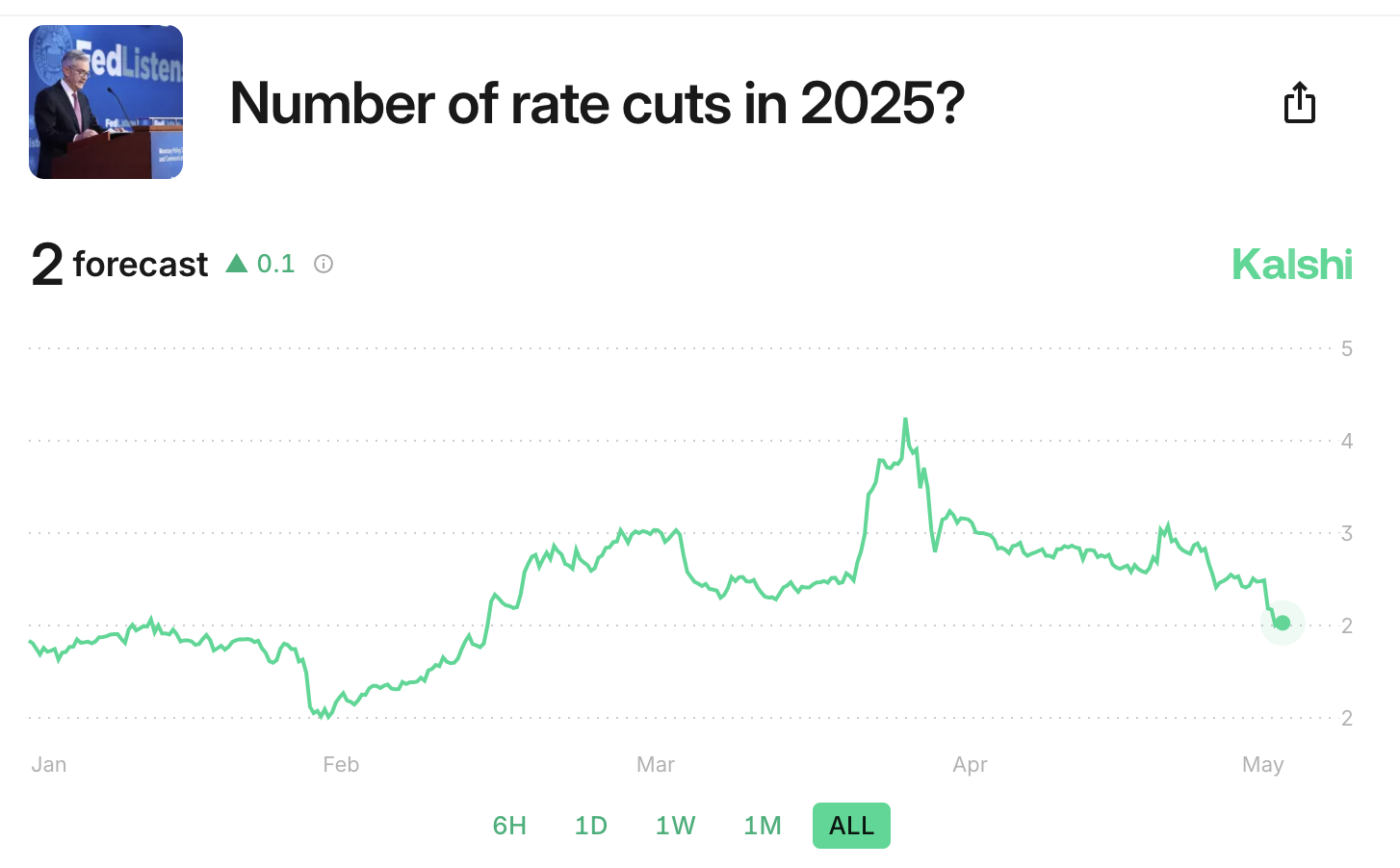 После заседания ФРС, прошедшего на прошлой неделе, Kalshi ожидает только два снижения ключевой ставки в этом году. Это соответствует прогнозам других площадок и аналитиков.