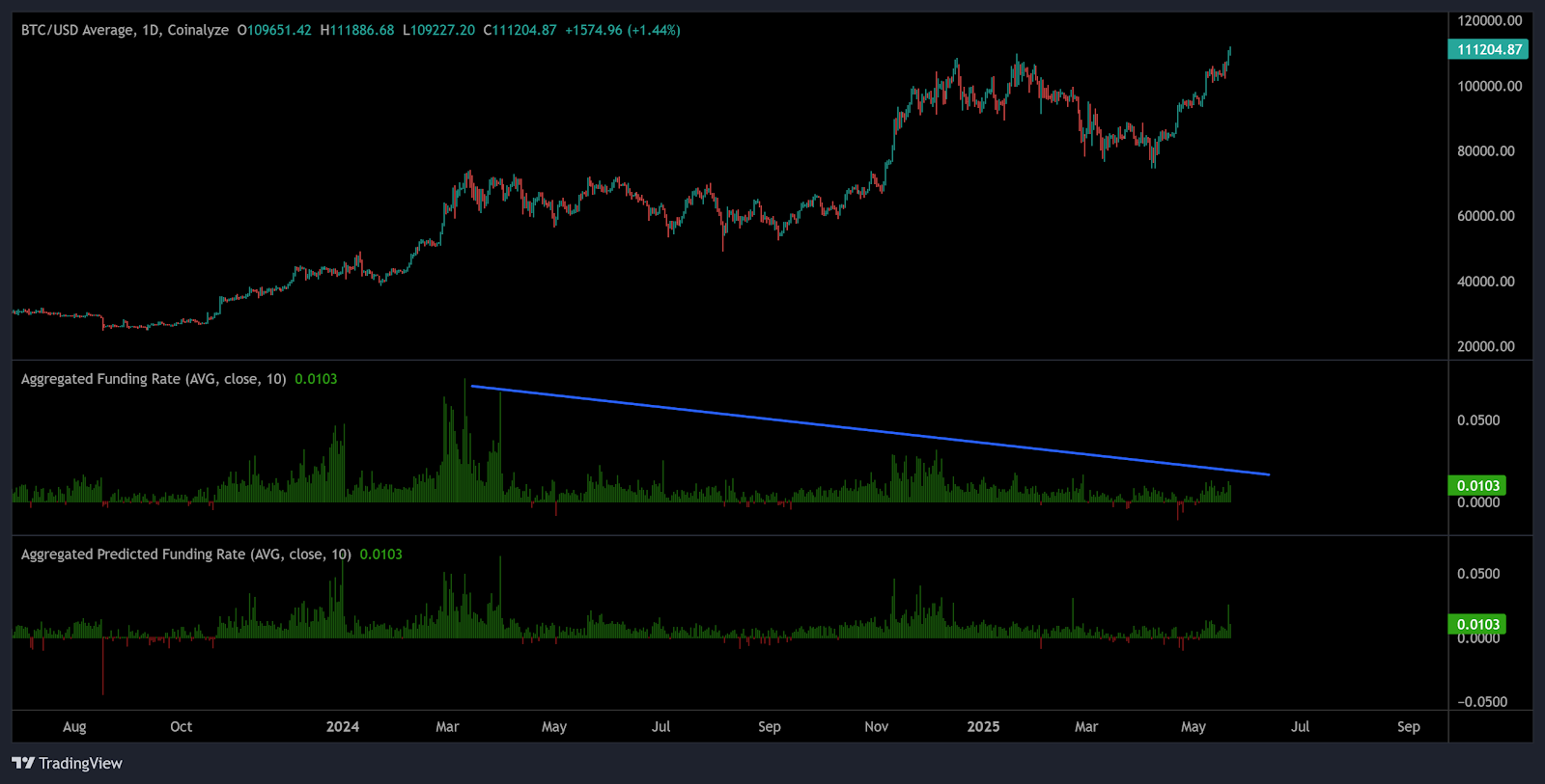 Данные показывают, что текущие ставки по фандингу BTC значительно ниже уровней, зафиксированных во время пиков в марте и ноябре 2024 года. Тогда рынок буквально кипел от спекуляций, а теперь — всё тихо и сдержанно. В первом квартале фандинг был в шесть раз выше, чем сейчас, а в четвёртом — в три. Это говорит о крайне низкой спекулятивной активности на рынке деривативов и о том, что текущий рост цен обеспечен в основном покупками на спотовом рынке. А это, как ни крути, гораздо более «здоровый» драйвер роста.