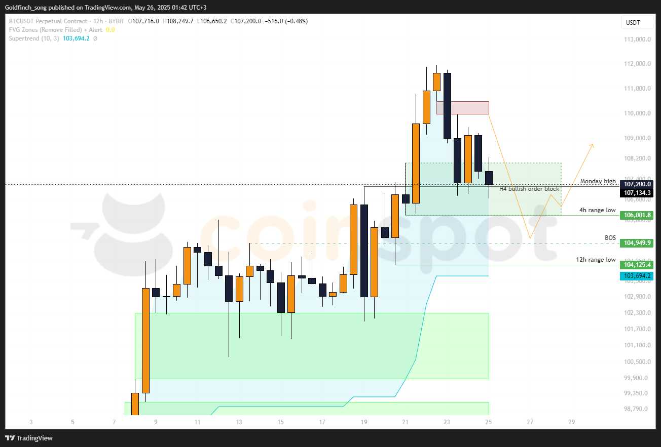 - Monday high (107,134) остаётся непробитым — это важная точка для подтверждения сетапа.