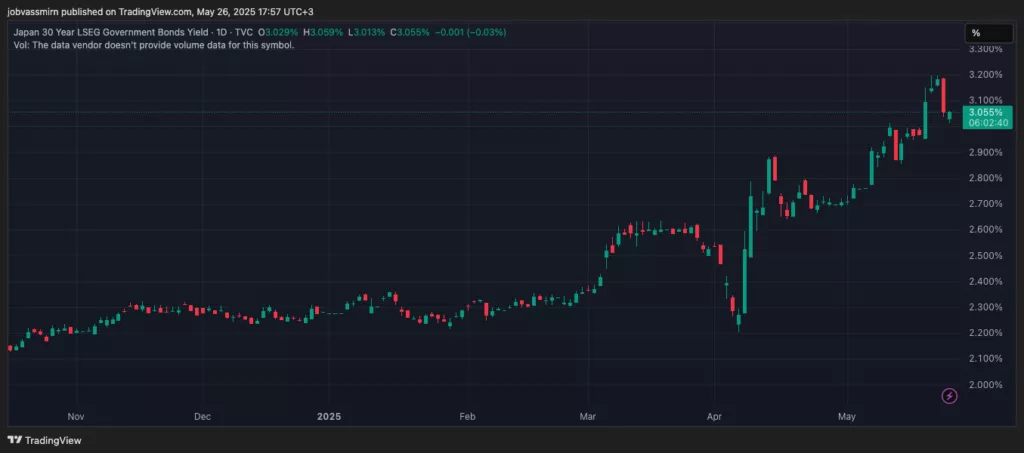 20 мая 30-летняя доходность японских облигаций достигла нового исторического максимума на уровне 3,185%, а к 23 мая снизилась до 3,115%.