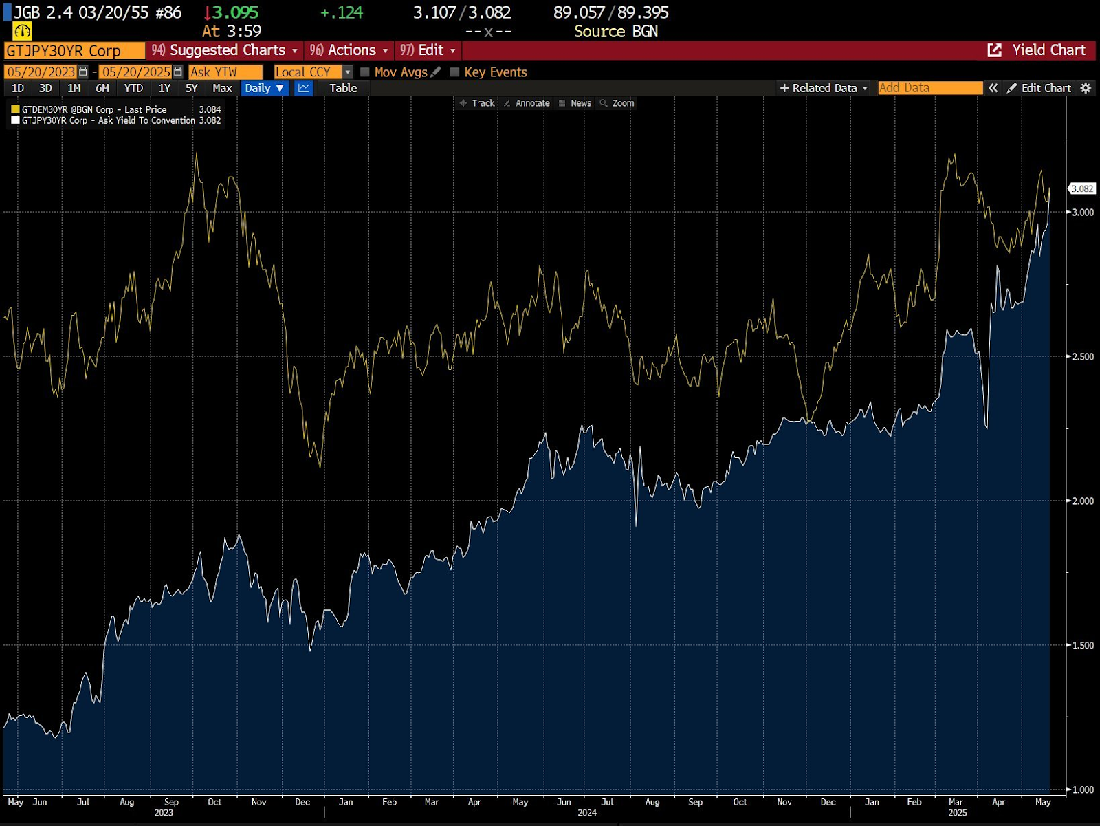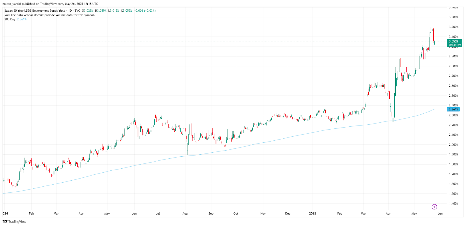 По данным TradingView, 30-летняя доходность японских облигаций достигла нового исторического максимума в 3,185% 20 мая 2025 года, а затем снизилась до 3,115% 23 мая.