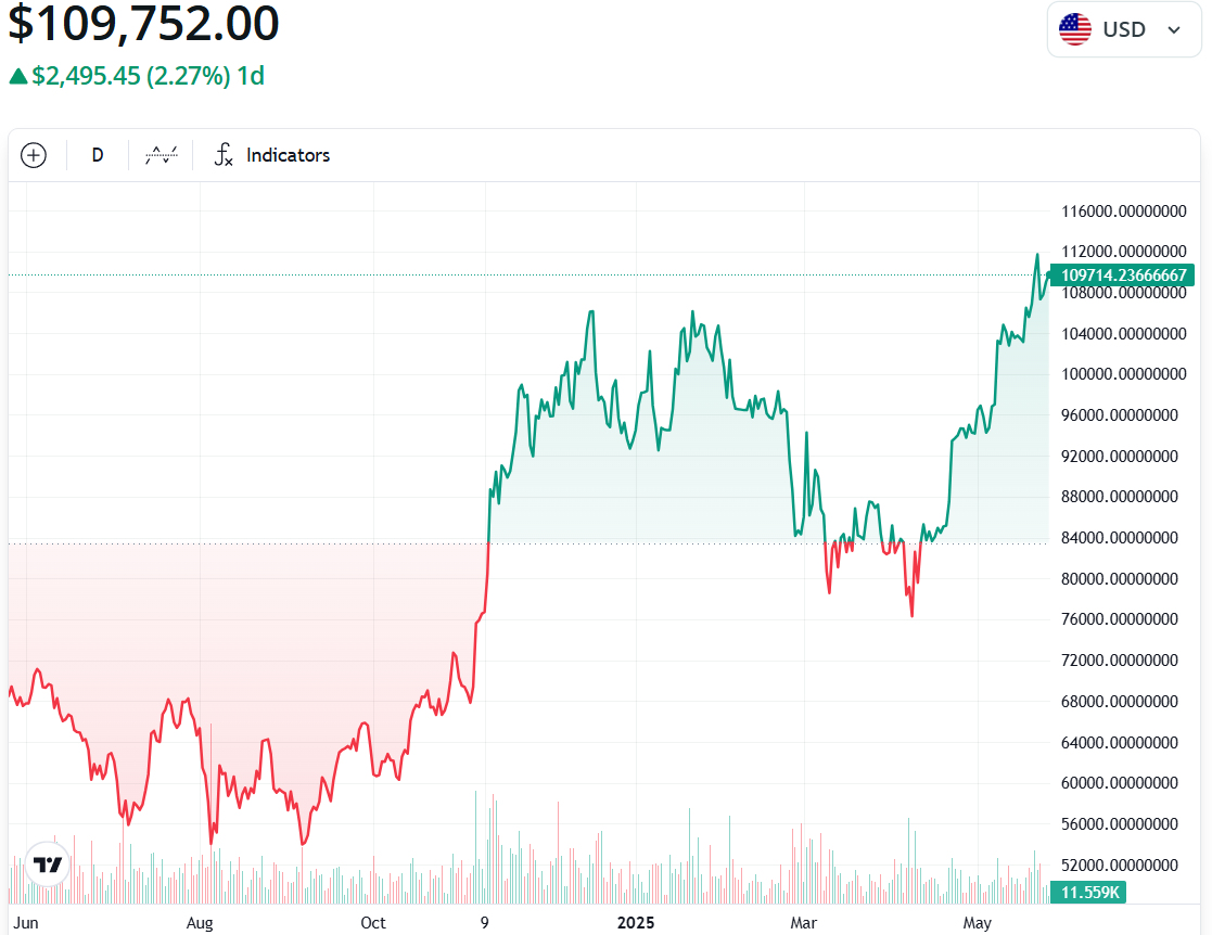 Цена биткоина выросла до нового исторического максимума в $112 000 22 мая, прежде чем откатиться и перейти к более высокой отметке $109 700 на момент написания статьи 26 мая.