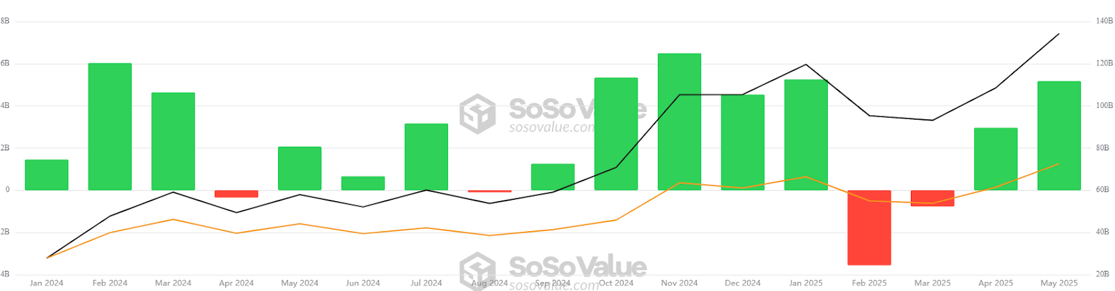 Между тем, спотовые биткоин-ETF США находятся менее чем в 1,3 млрд долларов от превышения ежемесячного рекорда притока в 6,49 млрд долларов с ноября 2024 года, сообщалось 23 мая.