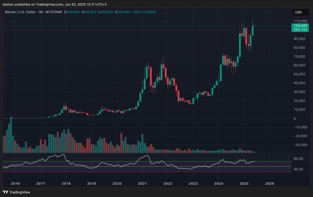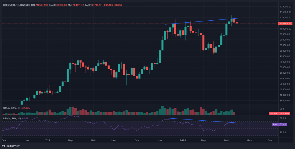 Биткоин завершил май с рекордным закрытием месяца на уровне $105 700, однако технические индикаторы указывают на возможность коррекции к отметке $100 000. Несмотря на впечатляющий рост в 11% за месяц, индекс относительной силы (RSI) демонстрирует медвежью дивергенцию — классический сигнал ослабления восходящего тренда.