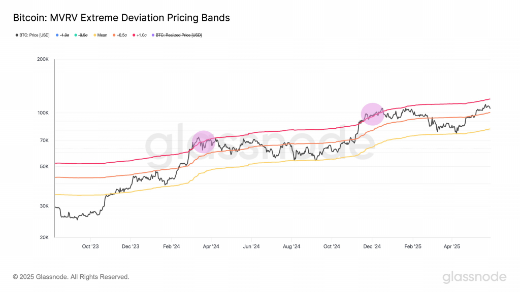 «Соотношение MVRV сравнивает рыночную цену BTC со средней базой затрат инвесторов — помогая оценить, когда инвесторы удерживают значительную нереализованную прибыль», — объяснила компания в соцсети X 30 мая.