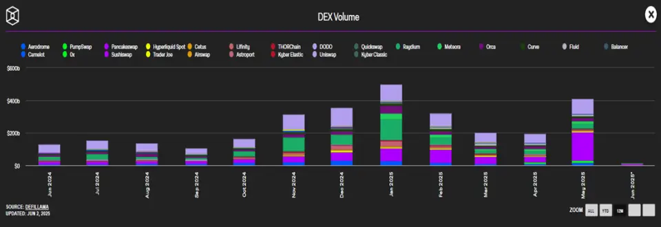 По данным аналитиков, это исторический максимум на фоне роста спроса со стороны пользователей и снижения популярности централизованных криптобирж (CEX). В мае лидером по объему торгов среди децентрализованных платформ стала PancakeSwap с показателем $171,6 млрд. Второе и третье место заняли биржи Aerodrome и PumpSwap с $15 млрд соответственно.