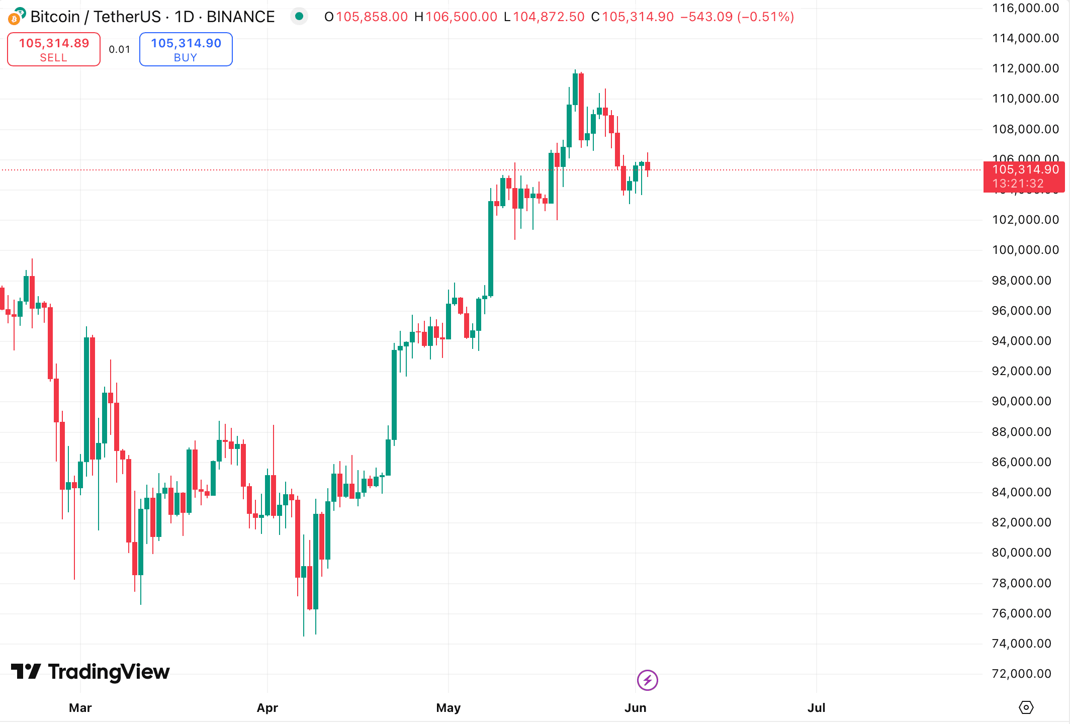 Первая криптовалюта находится на уровне почти $105 315, согласно TradingView на момент подготовки материала.