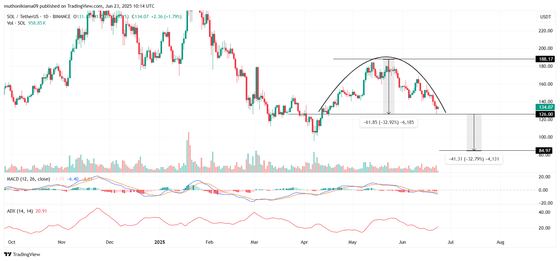 Сегодня, 23 июня, Solana торгуется по цене 134 доллара, при этом в течение 24 часов наблюдается высокая волатильность: цена колеблется между дневным минимумом в 126 долларов и дневным максимумом в 135 долларов. Поскольку настроения на рынке остаются негативными из-за конфликта между Израилем и Ираном, на фоне падения сети сформировалась медвежья модель «округлая вершина», указывающая на то, что цена Solana может упасть на 30% и опуститься ниже 100 долларов.