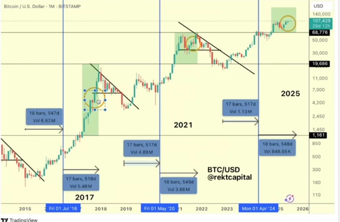 По мнению эксперта, курс биткоина достигнет пика в октябре, через 550 дней после халвинга. Rekt Capital отметил, что большинство участников рынка не обращают внимания на сокращение награды для майнеров, и предполагают, что бычий цикл продлится и в 2026 году.