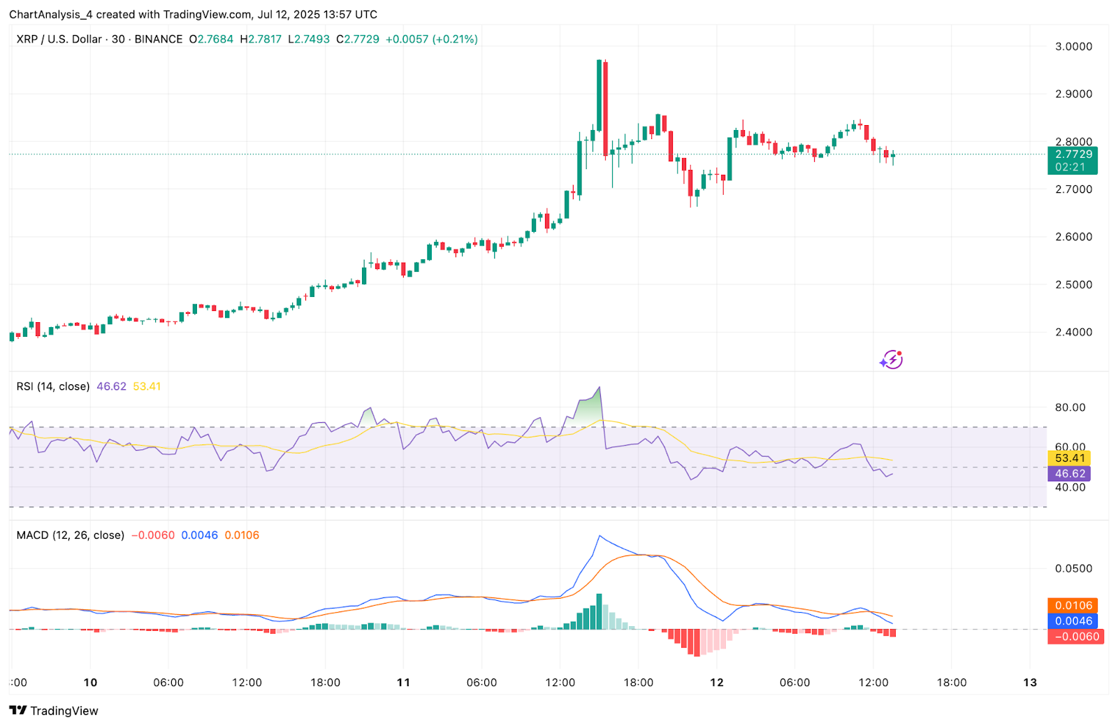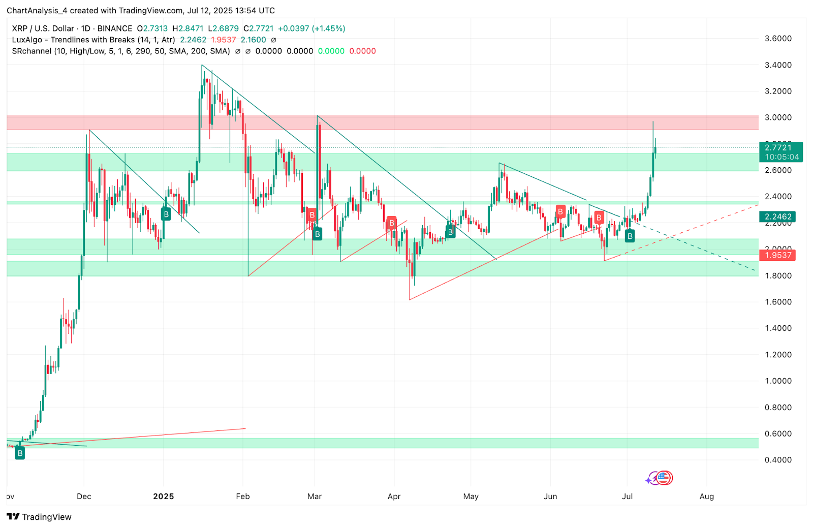 После резкого многодневного роста цена XRP вошла в фазу консолидации чуть ниже психологической отметки $2,80. Этот рост был вызван прорывом длительной структуры сжатия и теперь встречает сопротивление в районе $2,90–$3,00. Поскольку высокие объёмы торгов и индикаторы импульса по-прежнему благоприятствуют быкам, трейдеры внимательно следят за следующим решающим шагом.