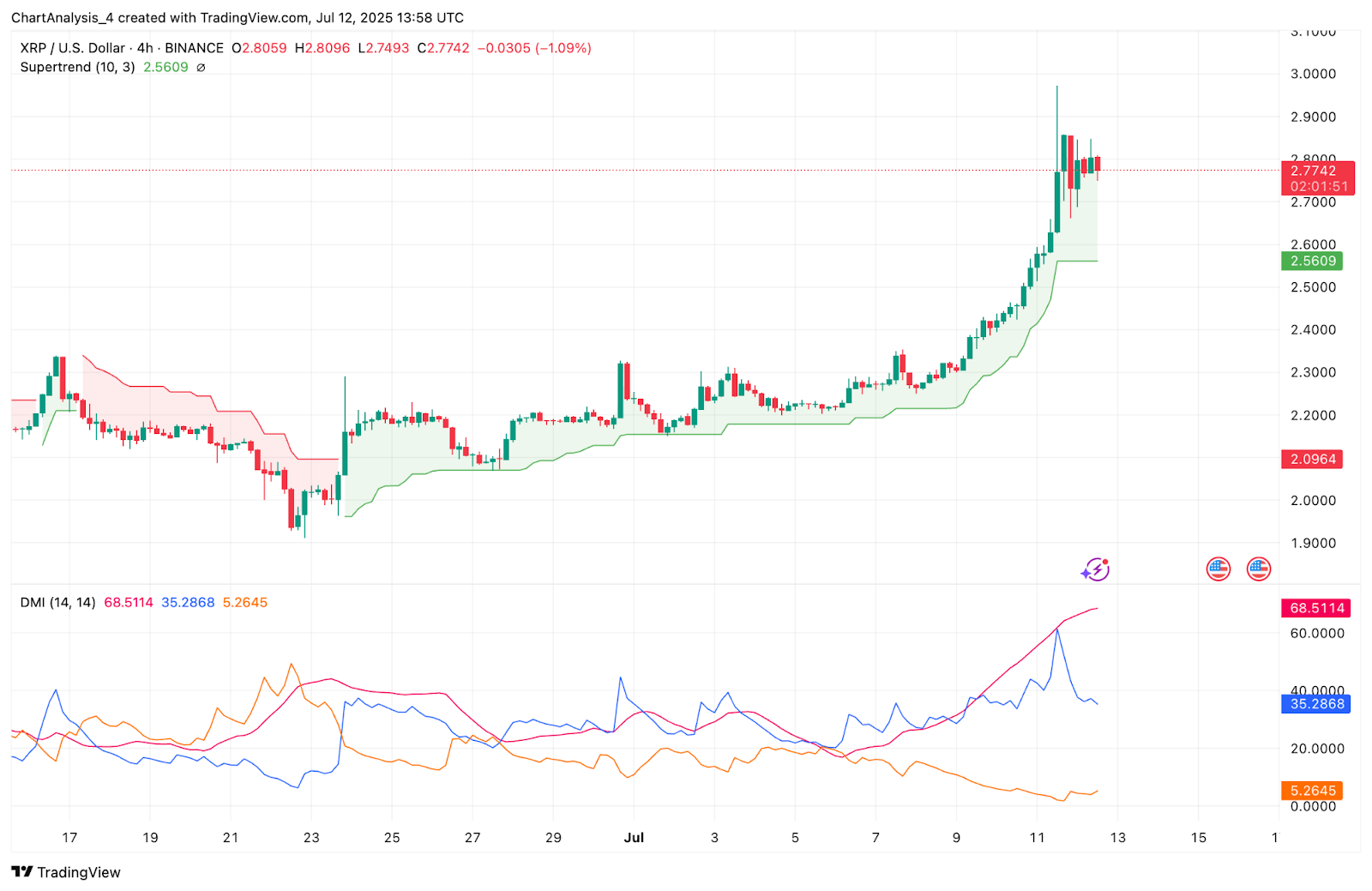 4-часовой индикатор Supertrend сохраняет бычий тренд с уровнем поддержки $2,56. Цена продолжает расти выше этого уровня, сигналов о смене тренда нет. DMI (индекс направленного движения) дополнительно подтверждает эту тенденцию: +DI находится выше 68 и значительно опережает -DI, в то время как ADX подтверждает силу тренда, превышая 35.