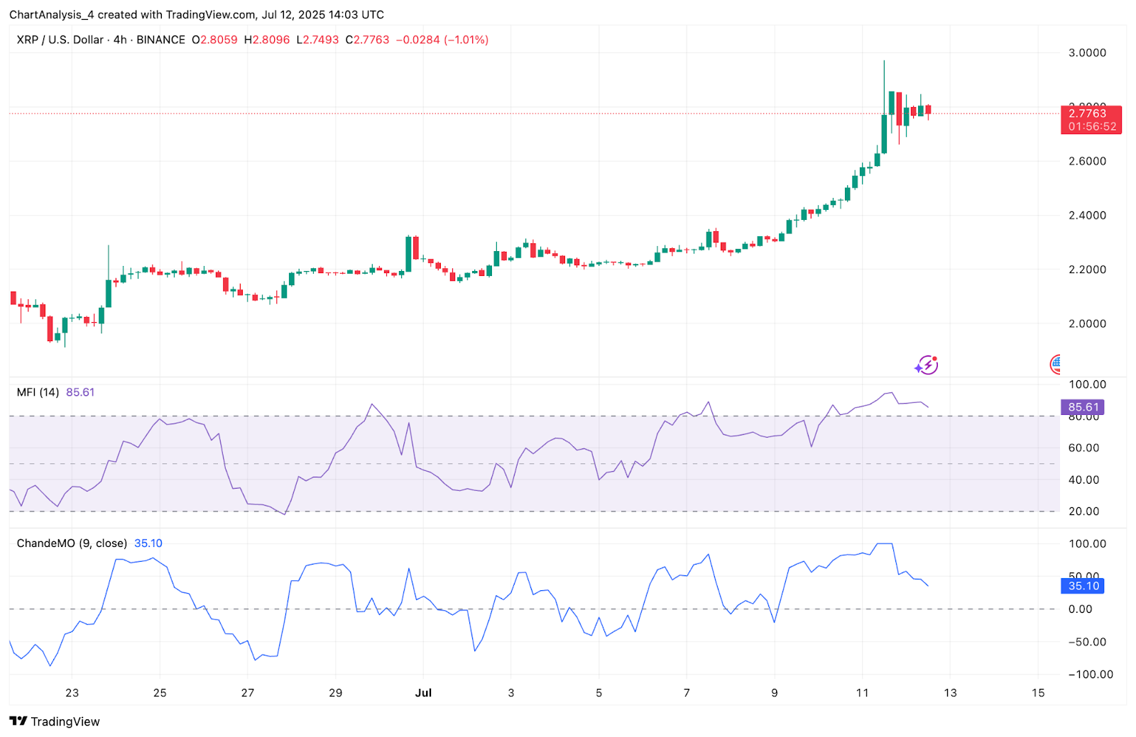 Полосы Боллинджера растянуты как на 4-часовом, так и на дневном графиках. Верхняя полоса находится вблизи $2,90, и цена неоднократно тестирует этот предел. Прорыв этого уровня может быстро поднять XRP до $3,10. Однако, если цена не удержится выше $2,75, это может спровоцировать небольшую коррекцию к $2,61–$2,64 (20 EMA и зоны средней полосы).