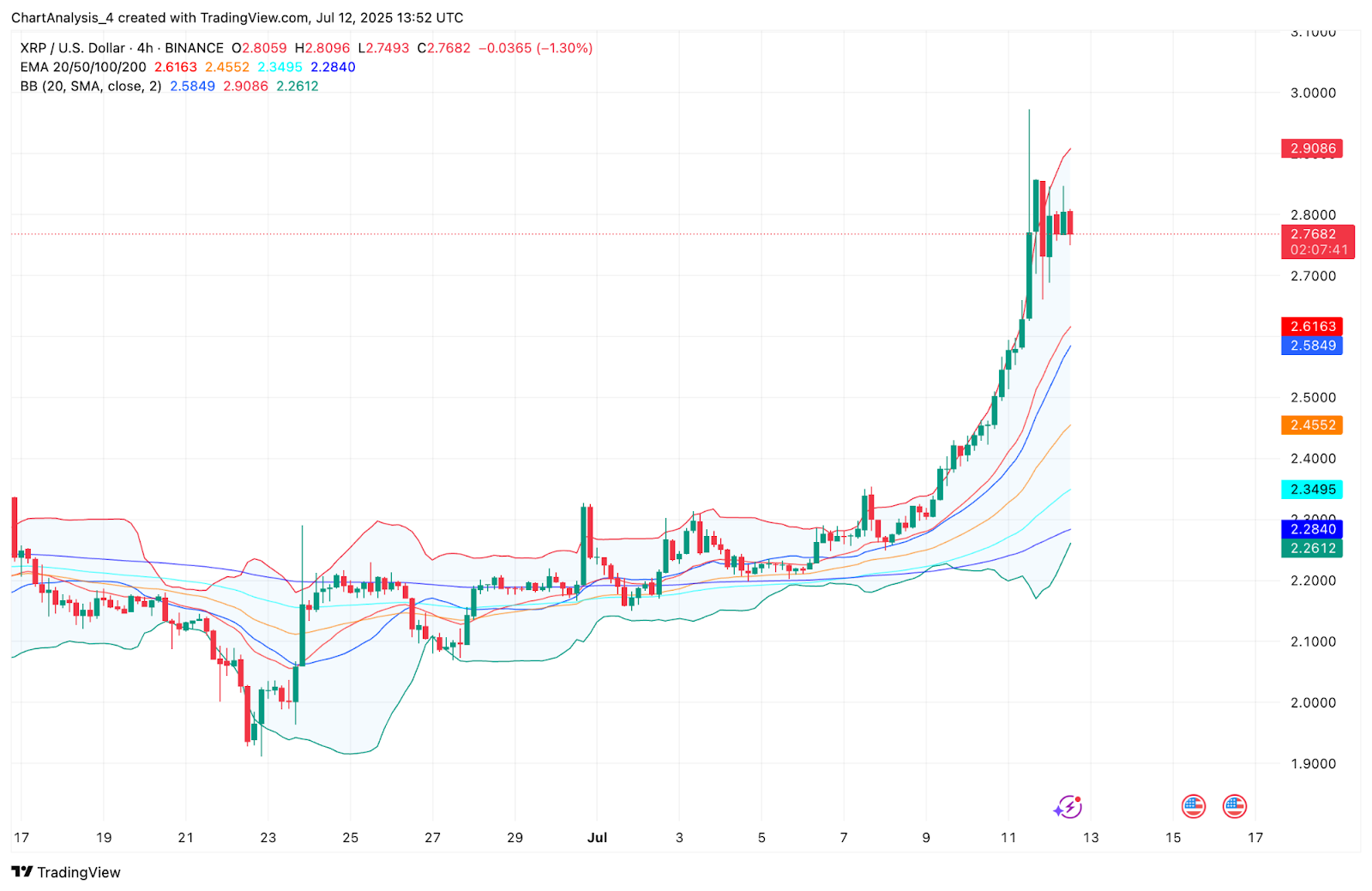 На 4-часовом графике XRP остаётся значительно выше всех основных экспоненциальных скользящих средних (EMA). 20-дневная EMA находится на уровне $2,61, а кластер EMA (50/100/200) находится значительно ниже, на $2,45, $2,35 и $2,28 соответственно, что указывает на сильное разделение по восходящей линии. Полосы Боллинджера расширяются, а XRP прижимается к верхней полосе, что указывает на сохраняющуюся волатильность и потенциал для нового импульсного движения.