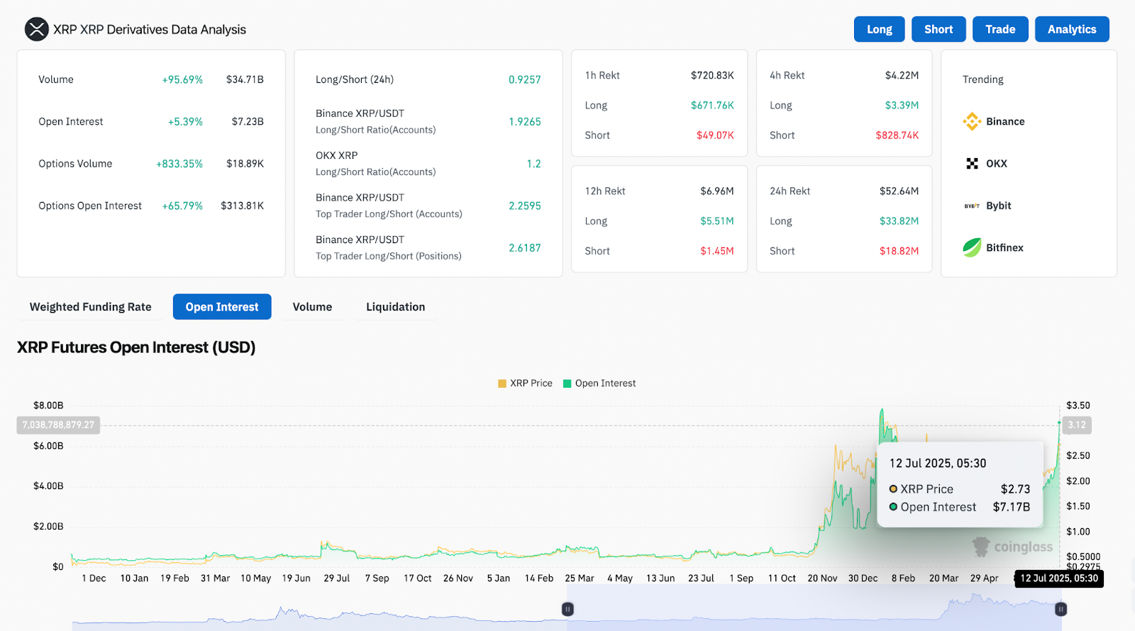 Причина сегодняшнего роста цены XRP кроется как в подтверждении структурного прорыва, так и в активном участии деривативов. Согласно данным Coinglass, дневной объём торгов вырос почти на 96%, достигнув $34,7 млрд, а открытый интерес увеличился более чем на 5%, достигнув $7,23 млрд. Активность на рынке опционов также резко возросла: объём торгов вырос на 833%, что свидетельствует о повышенном спекулятивном интересе.