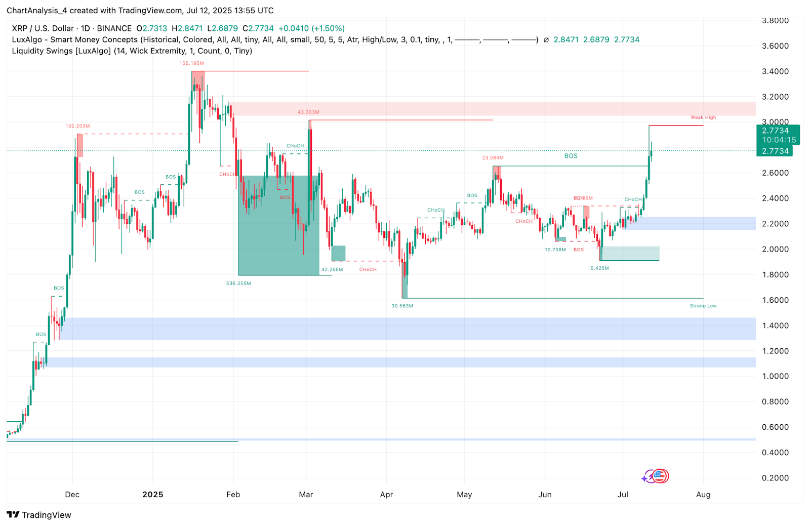 Прорыв превратил ключевые зоны сопротивления в поддержку, особенно в районе $2,45–$2,50. Уровень BOS (разрыв структуры) на графике Smart Money Concepts подтверждает смену импульса, поскольку предыдущие уровни CHoCH (изменение характера) теперь недействительны.