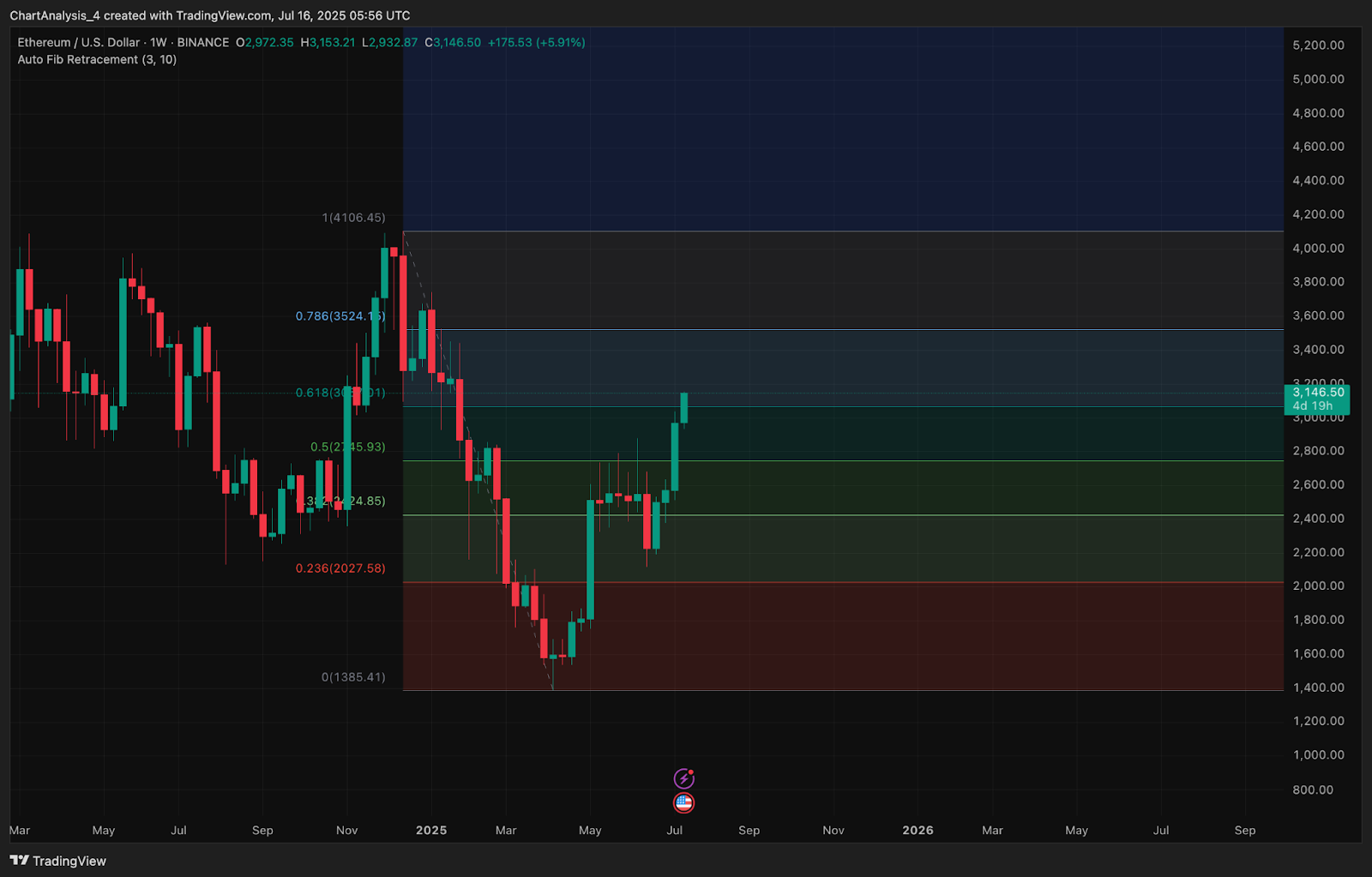 Эта область также совпадает с недельным сопротивлением Фибоначчи (уровень Фибоначчи 0,618 на отметке $3298) и предыдущими зонами отклонения с ноября 2024 года. Чистый прорыв выше этого уровня может открыть путь к уровню Фибоначчи 0,786 на отметке $3524.