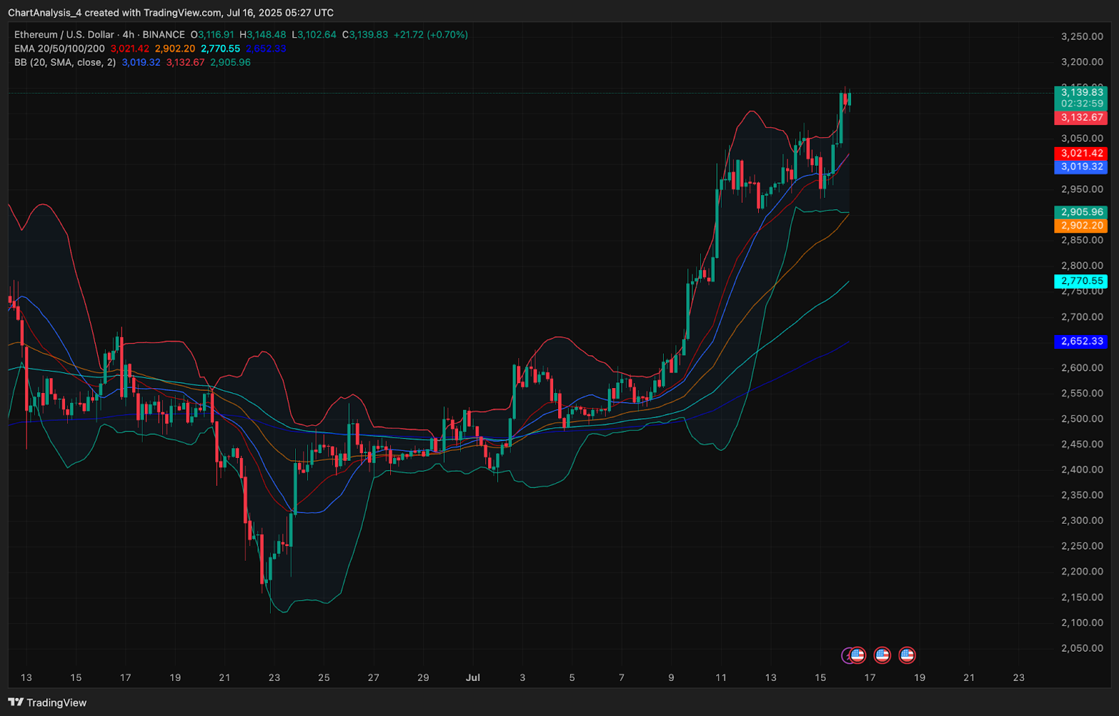 На 4-часовом графике цена Ethereum остаётся комфортно выше всех основных экспоненциальных скользящих средних (EMA). Кластер 20-, 50-, 100- и 200-дневных EMA между уровнями $2770 и $2902 теперь выступает в качестве сильной динамической поддержки. Полосы Боллинджера расширены, и цена удерживается вблизи верхней полосы, что указывает на сохранение активности нового цикла волатильности.