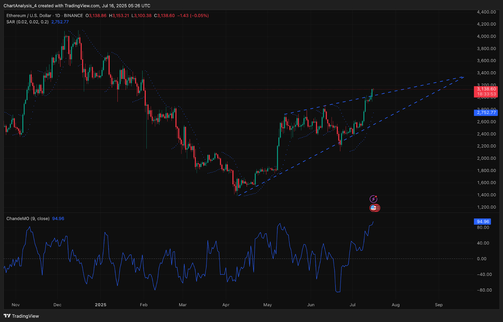 Дневная динамика показывает, что цена Ethereum пробила линию сопротивления $2850–$3000, сохраняя восходящий импульс. Сейчас цена торгуется вблизи $3145, чуть ниже верхней границы восходящего клина, наблюдаемого с апреля. Осциллятор импульса Чанде сигнализирует о чрезвычайной силе бычьего тренда, демонстрируя текущее значение 94,96. Это максимальное значение с конца 2021 года, подтверждающее устойчивое доминирование покупателей.