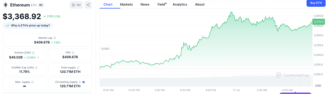 За последние сутки Ethereum зафиксировал рост на 7,16%, достигнув максимума в $3368,92 17 июля.