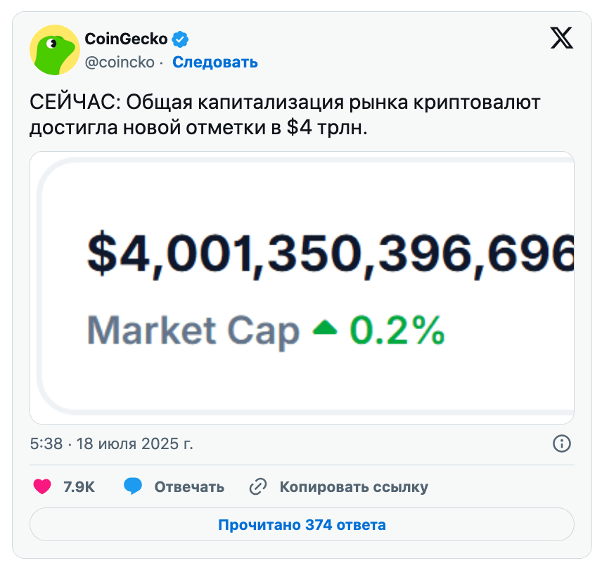 Рыночная капитализация в $4 трлн позволит криптовалютам уступить лишь Nvidia — крупнейшей в мире публичной компании. 9 июля её капитализация впервые превысила $4 трлн, а сейчас составляет $4,2 трлн.