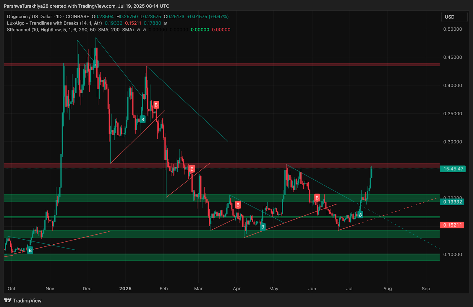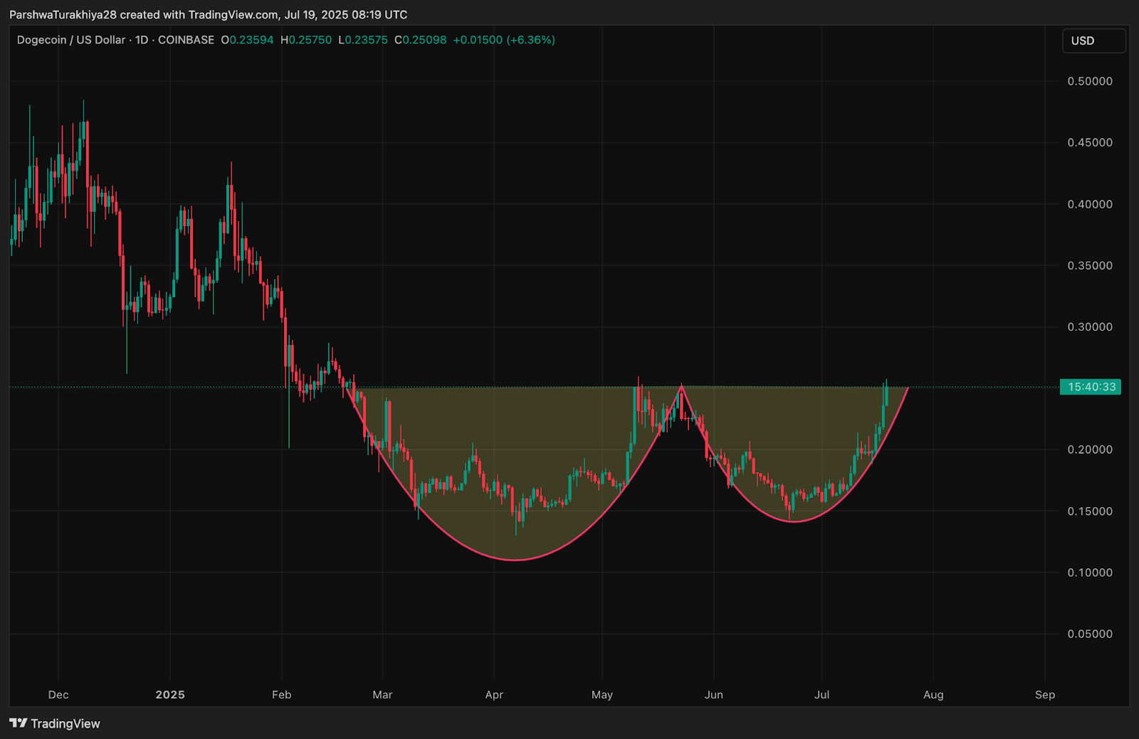 На дневном графике показана чёткая модель «чашка с ручкой», простирающаяся с марта по июль 2025 года. DOGE сформировал округлую форму в диапазоне от $0,128 до $0,26 в течение нескольких месяцев, после чего последовал неглубокий откат в области ручки и пробой выше $0,25. Прорыв линии шеи подтверждает бычий паттерн продолжения роста с потенциальной целевой отметкой около $0,32.