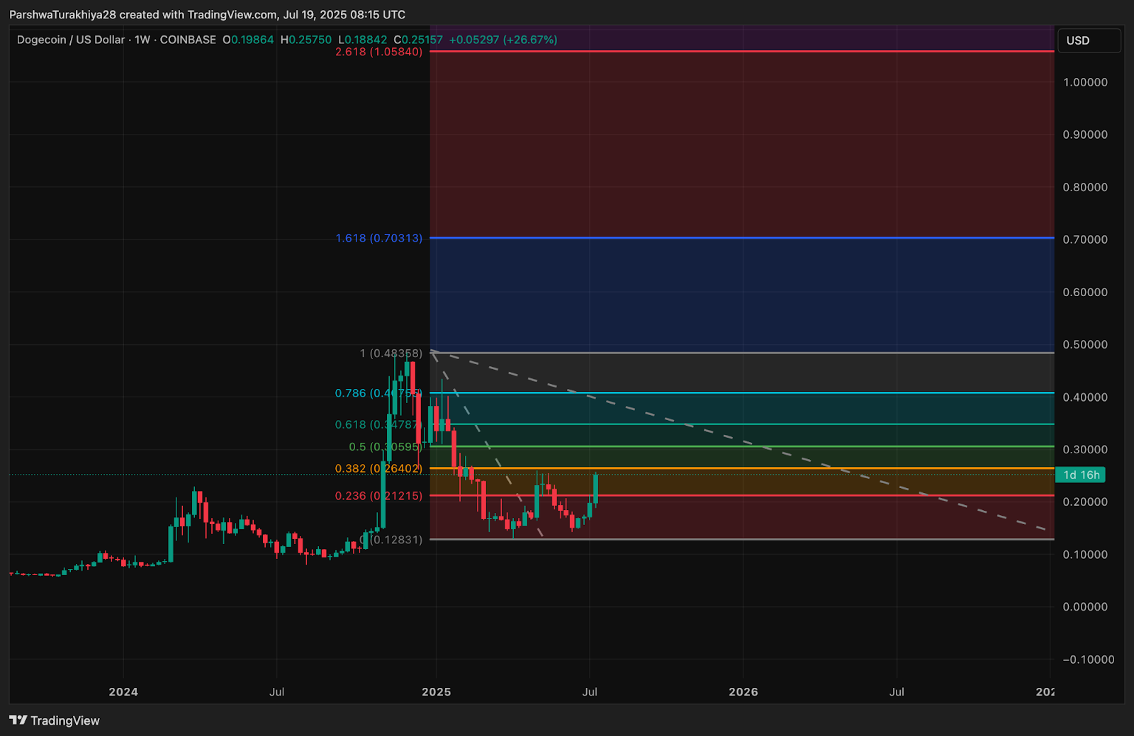 Цена Dogecoin отыграла ключевой уровень прорыва $0,25 и теперь стремится к следующему сопротивлению на $0,258 и $0,264. Успешное закрытие выше $0,264 откроет путь к повторному тестированию $0,30 и потенциально $0,32, что соответствует измеренному движению модели и зоне Фибоначчи 0,5.