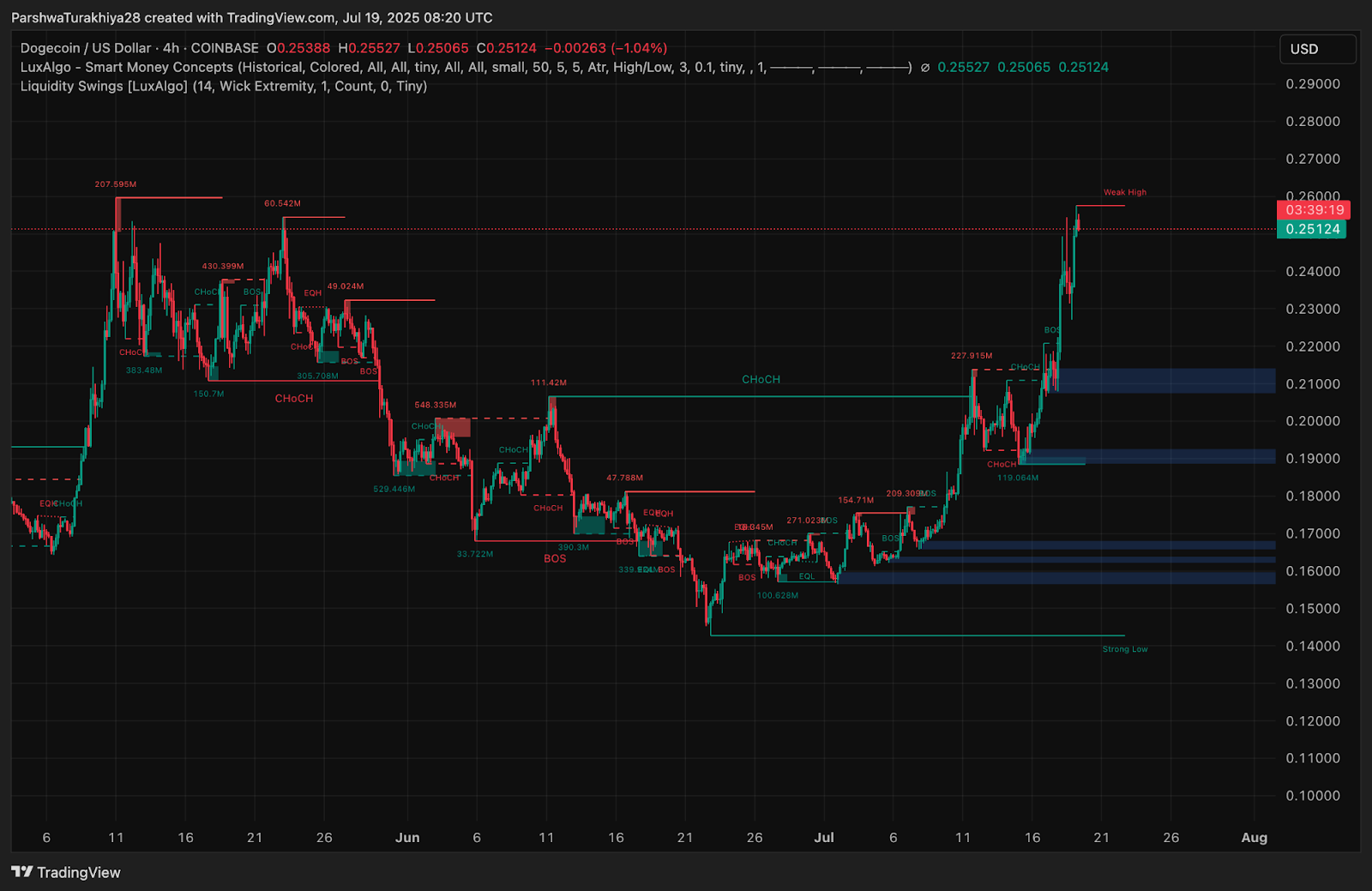 Этот прорыв подтверждается индикатором Smart Money Concepts на 4-часовом графике, который показывает несколько подтверждений разрывов структуры (BOS) и смены характера (CHoCH) во время ралли. Цена также поднялась и закрылась выше ключевых зон ликвидности в районе $0,24, подтверждая переход контроля над трендом от медведей к быкам.