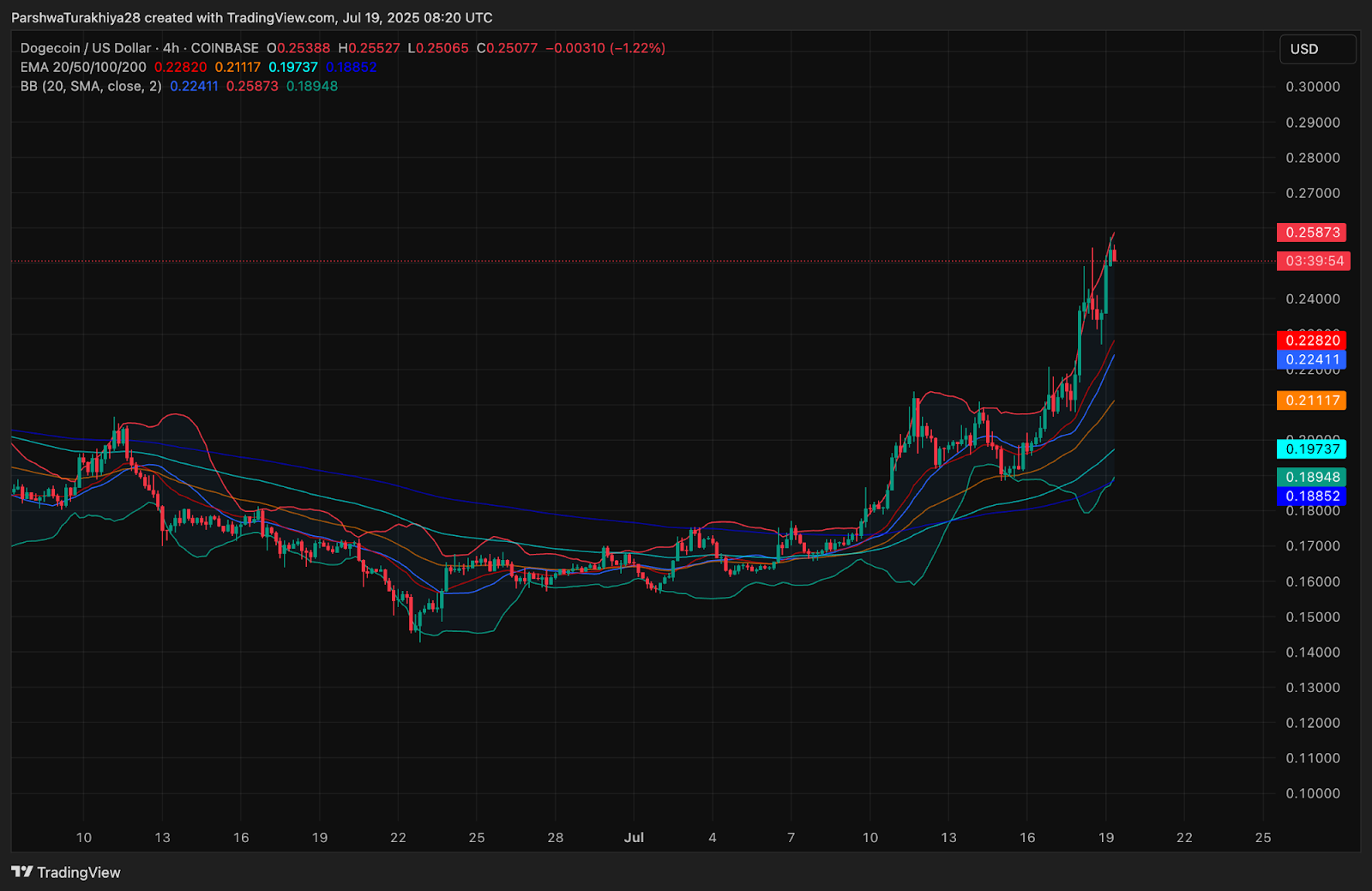 На 4-часовом таймфрейме DOGE торгуется выше своих 20/50/100/200 EMA, которые сейчас расположены в бычьем порядке между $0,188 и $0,228. Такое расположение EMA обеспечивает динамическую поддержку ниже цены, в то время как полосы Боллинджера расширяются, что указывает на новую волатильность. Верхняя полоса в настоящее время находится вблизи $0,258, что совпадает с краткосрочным сопротивлением.