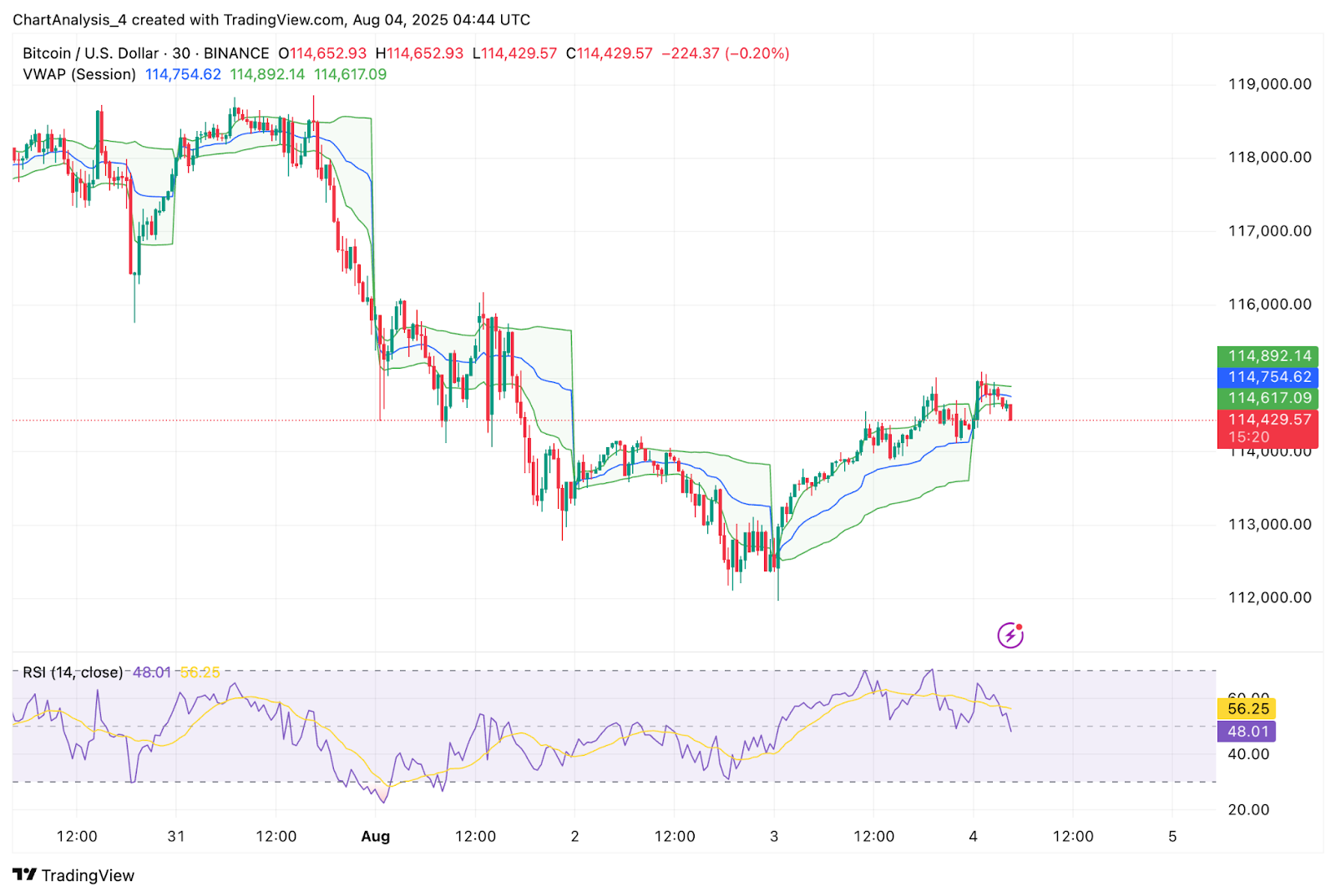 Краткосрочные показатели отражают нерешительность. 30-минутный RSI находится на уровне 48,01, дрейфуя ниже нейтральной отметки 50. Это значение, наряду с неспособностью восстановить сопротивление средней линии VWAP на уровне $114 754, указывает на нерешенное перетягивание каната. Цена кратковременно протестировала верхнюю полосу VWAP ($114 892), но не смогла удержаться выше нее.