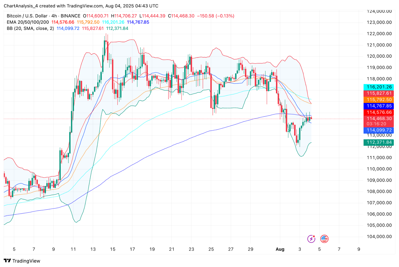 Причина недавнего застоя BTC и незначительных распродаж кроется как в отскоке ценовой структуры, так и в данных по смешанным деривативам. 4-часовые полосы Боллинджера показывают явное сжатие, указывающее на сжатие волатильности. Цена в настоящее время движется к 20 EMA ($114 576), но по-прежнему ограничена 50 EMA ($115 792) и 100 EMA ($116 201). Этот кластер создает слоистое сопротивление.