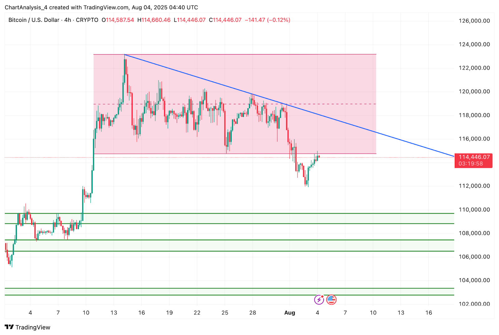 Структура цены биткоина остается под давлением, как видно на 4-часовом графике, где BTC находится ниже нисходящей линии тренда, простирающейся от локального максимума июля. Зона красного ящика между $116 000 и $121 000 продолжает выступать в качестве широкой области предложения. Цена недавно отскочила от нижней границы этого диапазона и сейчас консолидируется чуть выше $114 000.