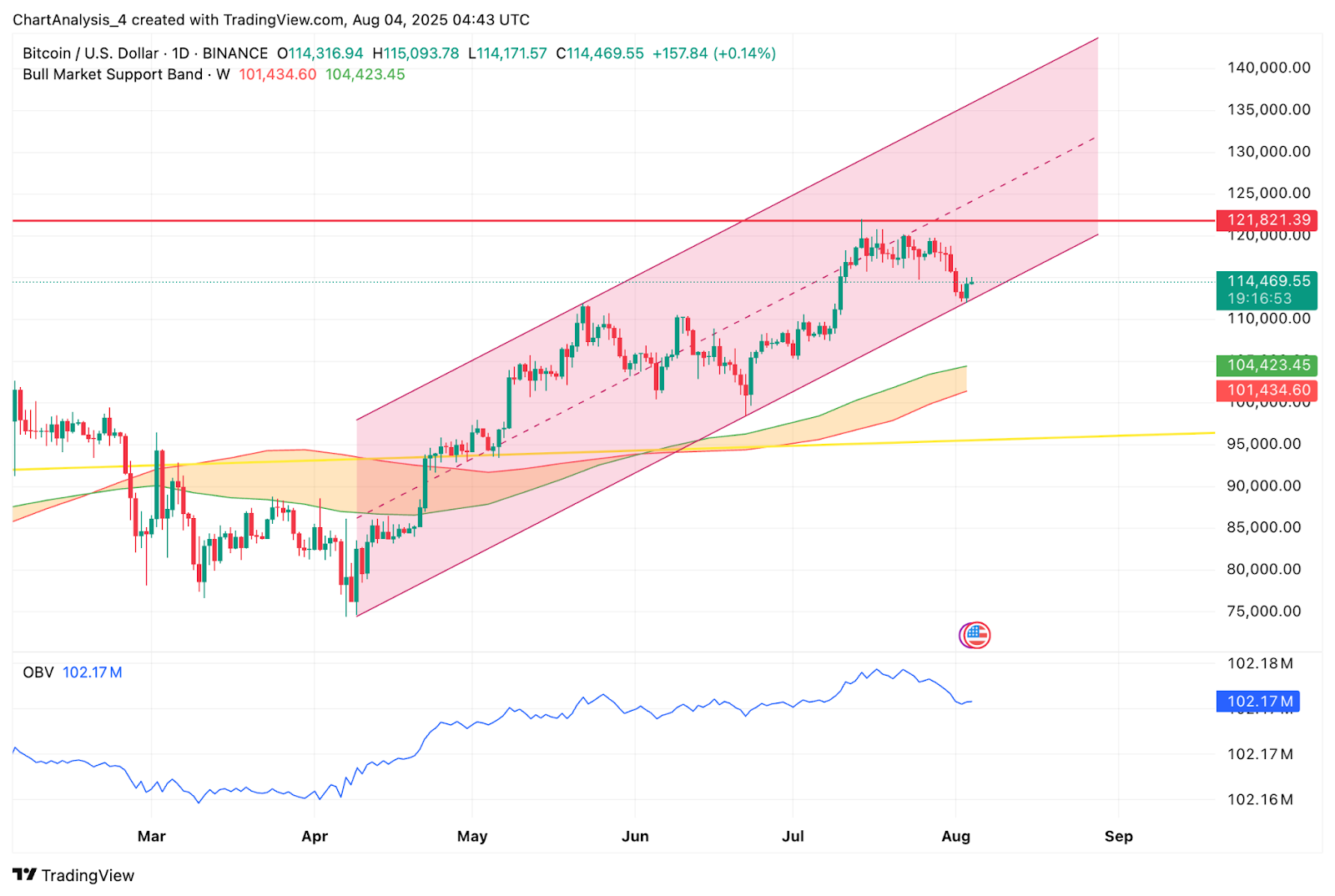 После падения ниже ключевых внутридневных уровней поддержки на прошлой неделе, цена биткоина сегодня остается в диапазоне около $114 400. Несмотря на скромный отскок от уровней ниже $112 000, восходящий импульс продолжает замедляться под нисходящей линией сопротивления, которая ограничивала каждое краткосрочное восстановление с середины июля. Поскольку позиции деривативов все еще осторожны, а технические данные указывают на сжатие, трейдеры рассматривают область $116 000 как следующее ключевое поле битвы.
