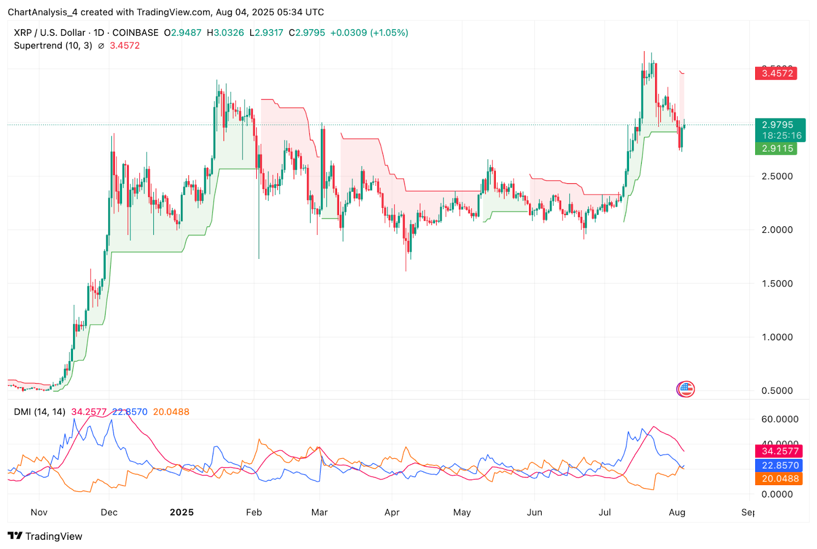 4-часовой супертренд остаётся медвежьим, с линией переворота, которая сейчас близка к $3,45. Если XRP не прорвётся и не удержится выше $3,03, супертренд продолжит сигнализировать о осторожности. Тем временем, индекс направленного движения (DMI) на дневном графике показывает, что +DI снова начинает расти, но -DI по-прежнему опережает. ADX выше 20, что указывает на силу тренда, но направление остаётся неопределённым.