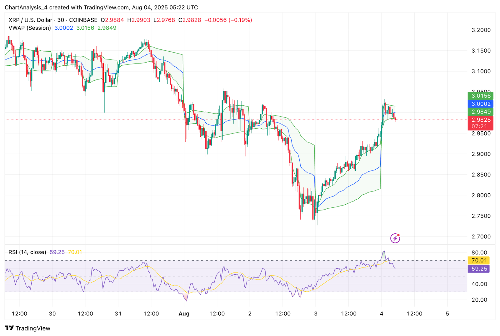 Сегодняшний рост цены XRP можно объяснить сочетанием технического отскока и краткосрочного притока средств. 30-минутный график VWAP показывает, что XRP ненадолго отыграл среднюю линию поддержки сессии на уровне $2,984, а затем слегка откатился назад. Отскок произошёл как раз в тот момент, когда RSI вошёл в зону перекупленности, коснувшись отметки 70, а затем опустившись до 59, что говорит о возможной приостановке роста, если объём торгов не увеличится.