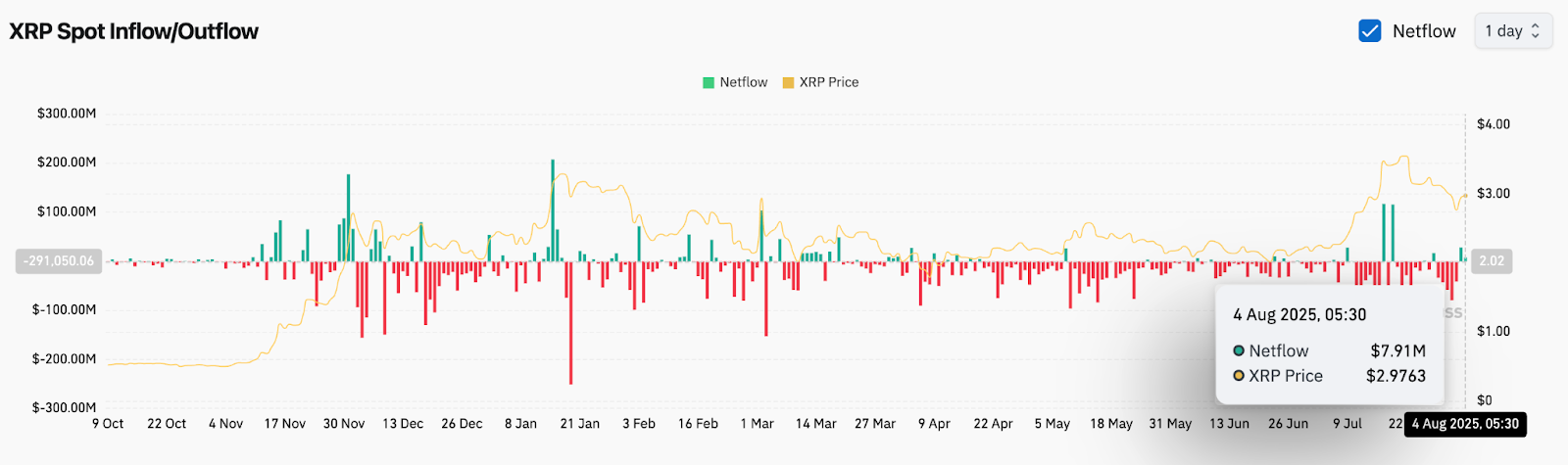 Спотовые потоки на блокчейне демонстрируют скромный чистый приток средств в размере 7,91 млн долларов США в XRP на биржах за последние 24 часа. Хотя это и небольшой показатель, он отражает умеренный интерес покупателей по мере приближения цены к вершине «клина». Этот приток контрастирует с устойчивым оттоком, наблюдавшимся на прошлой неделе, что свидетельствует о краткосрочной смене настроений.