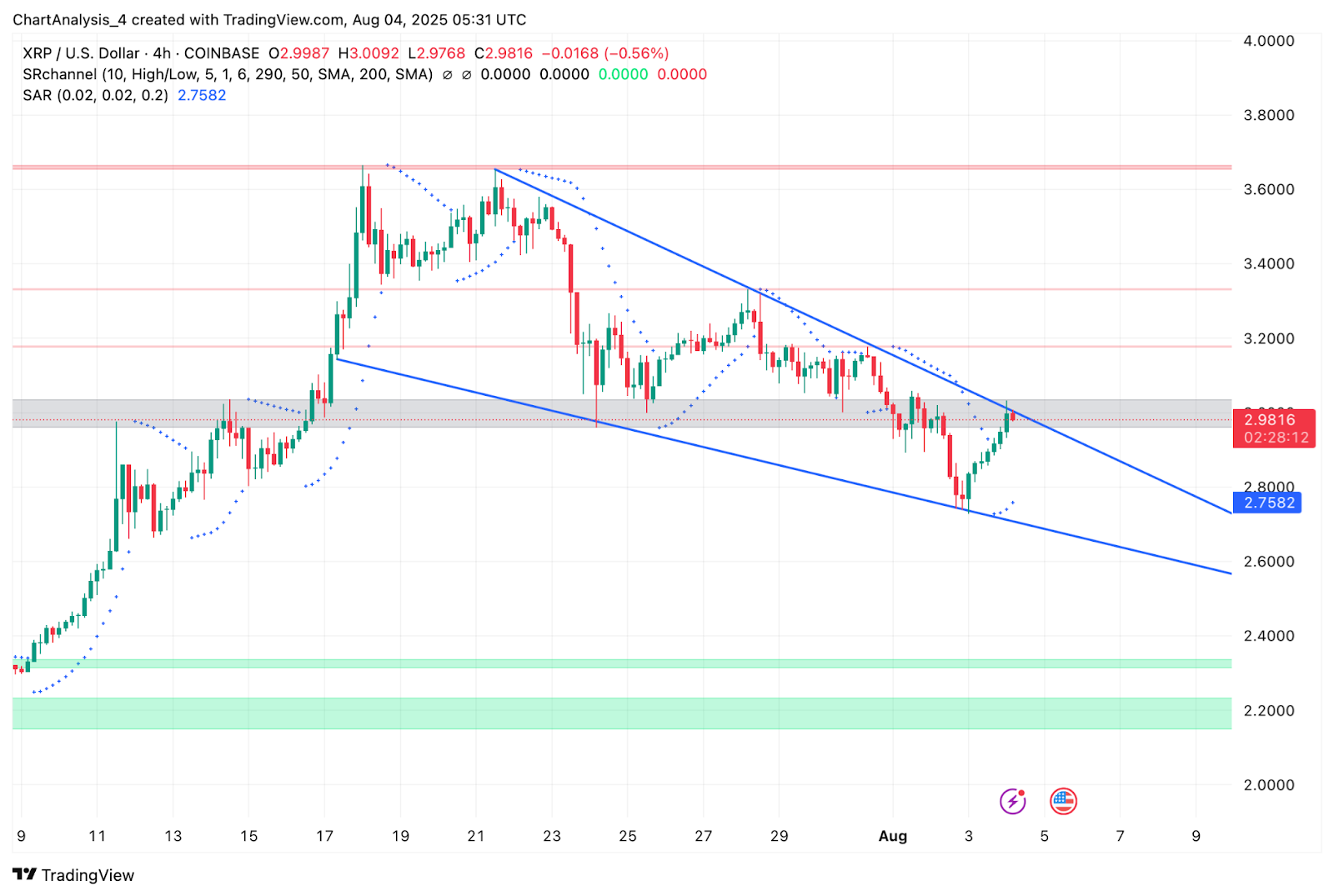 Если XRP закроется выше $3,03 на растущем объёме, прорыв нисходящего клина будет подтверждён. В этом случае быки могут нацелиться на следующее сопротивление в районе $3,25, а затем на $3,45, максимум июльского колебания. Однако, если цена не закроется выше $3,00, это может спровоцировать откат к $2,85 и даже $2,75, где присутствуют как поддержка трендовой линии, так и прежний спрос.
