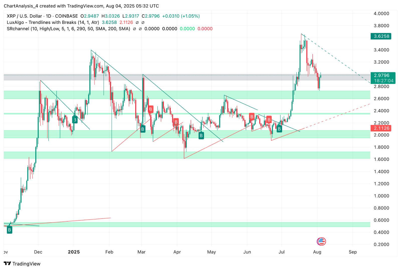 С другой стороны, если $2,75 не удержится, нижняя линия тренда в районе $2,60 станет следующей структурной зоной. Восстановление $3,03 при сильном подтверждении крайне важно для быков, чтобы восстановить направленный импульс во вторую неделю августа.