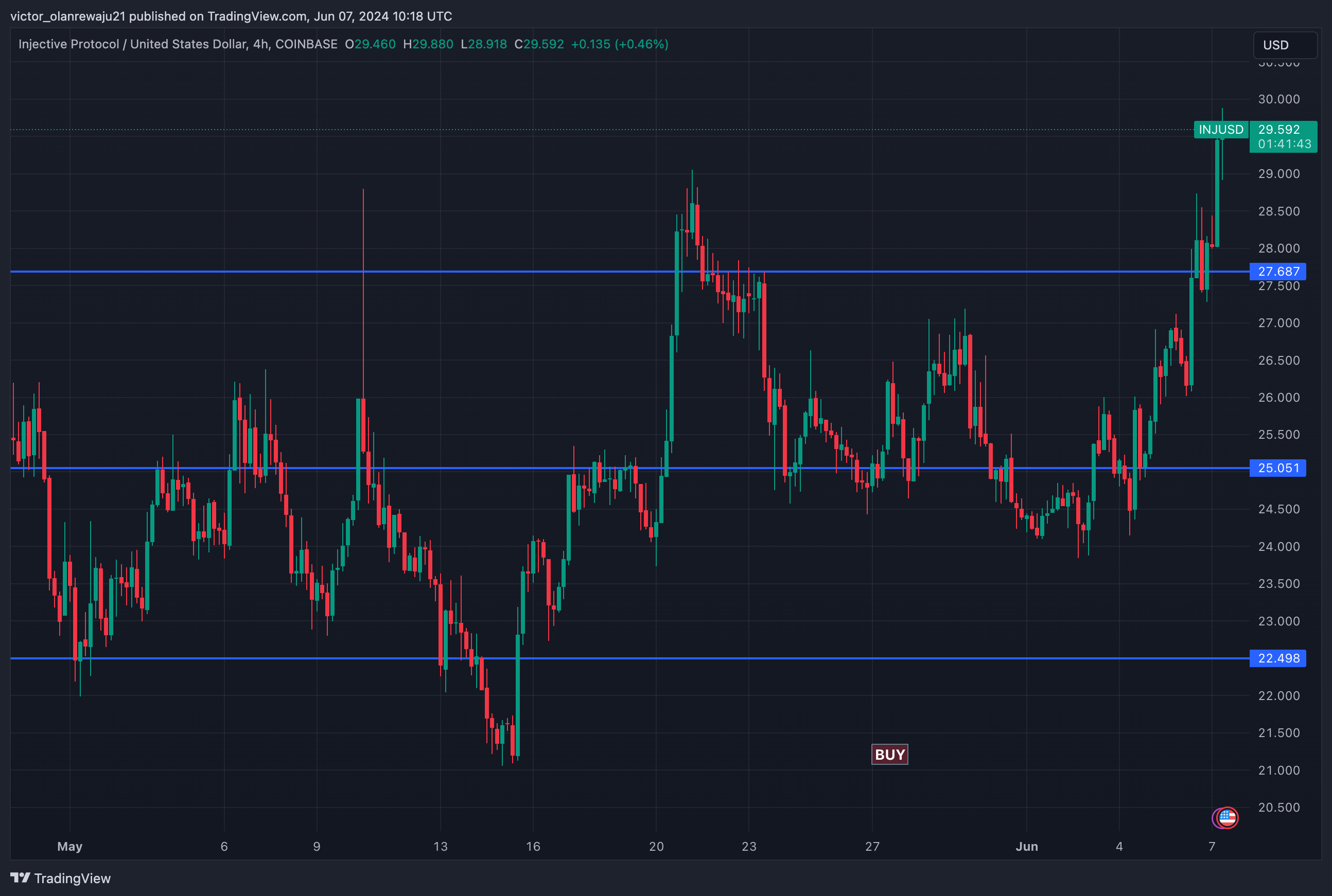 Coin Edition вернулся к 4-часовому графику INJ/USD, чтобы проанализировать уровни поддержки и сопротивления для токена. На графике мы заметили поддержку на уровне 22,49 доллара, которая была жизненно важна для ралли токена до исторического максимума.