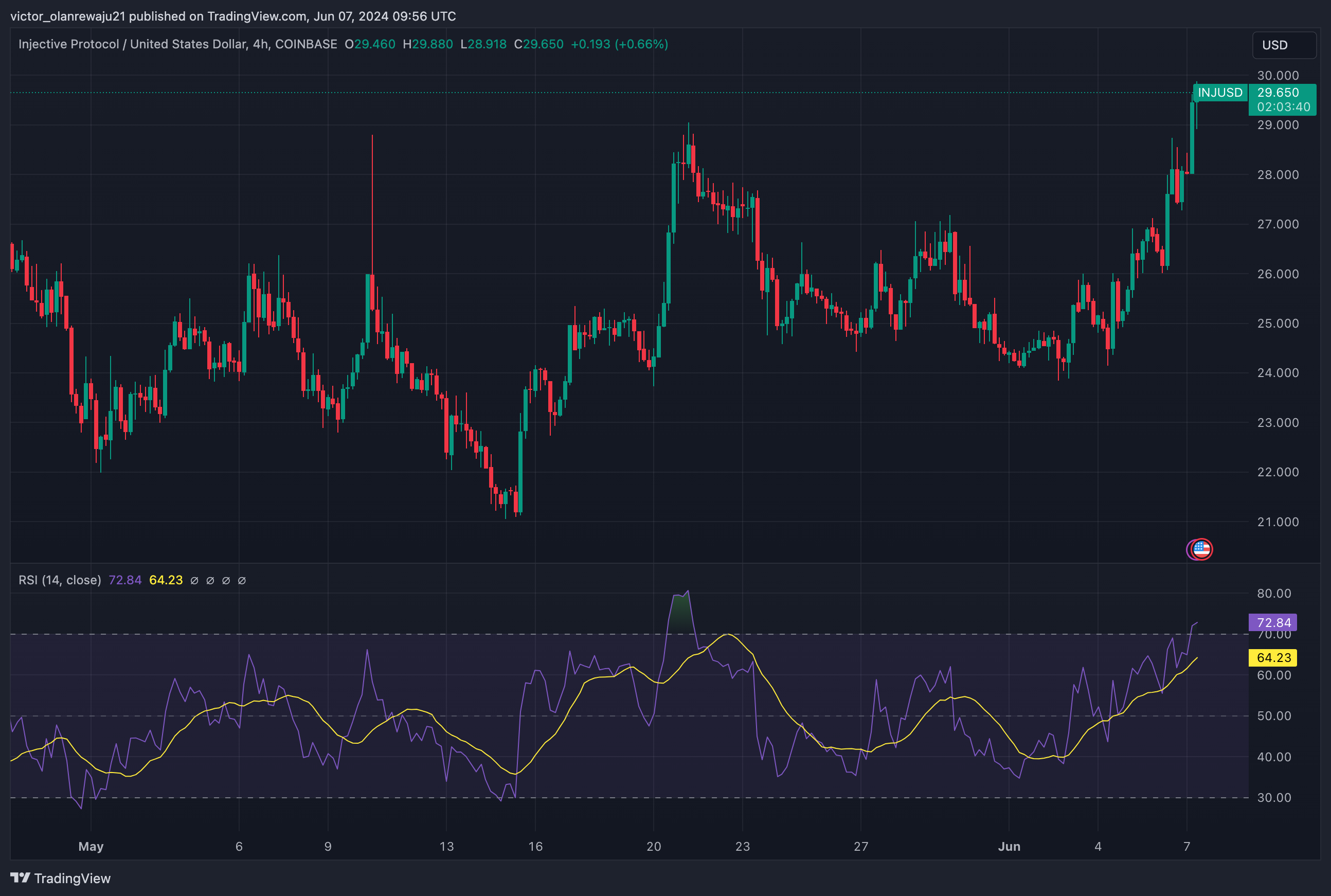Согласно 4-часовому графику, индекс относительной силы (RSI) составил 72,50. Этот показатель был индикатором того, что импульс вокруг INJ был бычьим.