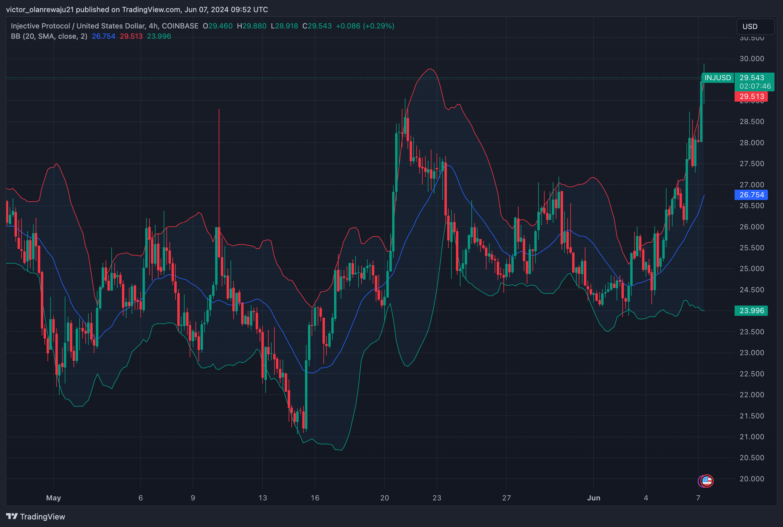 На момент написания статьи полосы Боллинджера (BB) расширились, что указывает на то, что волатильность вокруг токена увеличилась. Это также стало одной из причин, по которой цена INJ выросла до $29,80. С расширением INJ может испытать дикие колебания цен.