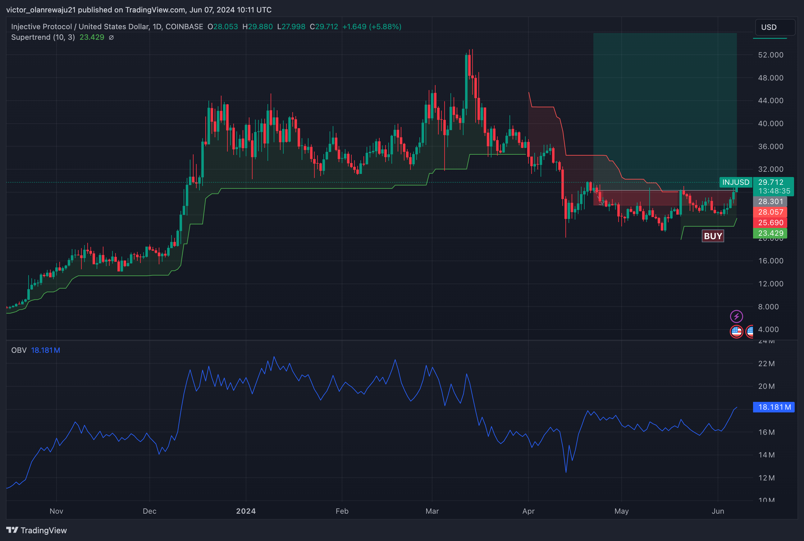 Чтобы проанализировать прогноз цены на 2024 год, Coin Edition посмотрел на график INJ/IUSD. Одним из индикаторов для прогнозирования цены был балансовый объем (OBV), который измеряет давление покупателей и продавцов.