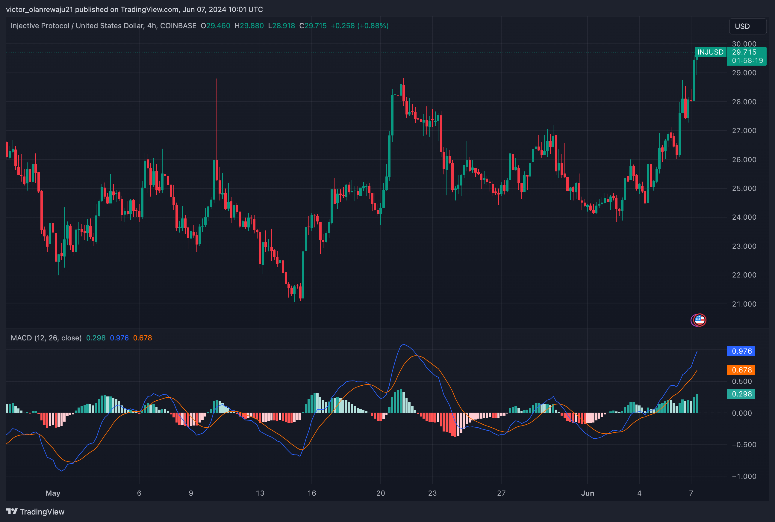 Схождение-расхождение скользящих средних (MACD) указывает на импульс, как и RSI. На момент написания статьи MACD был положительным, что говорит о том, что импульс вокруг INJ был бычьим.