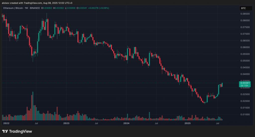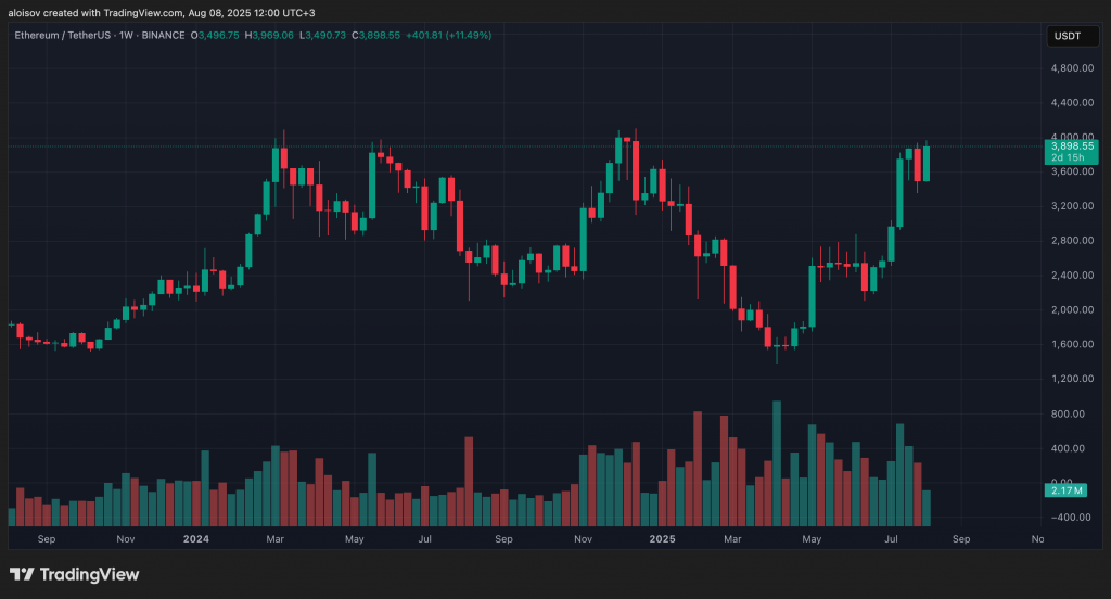 За последние 24 часа Ethereum подорожал на 6% и торгуется на уровне $3 898 согласно данным Binance. Соотношение ETH/BTC, которое показывает относительную силу Ethereum по отношению к биткоину, выросло на 38% за последние 30 дней.