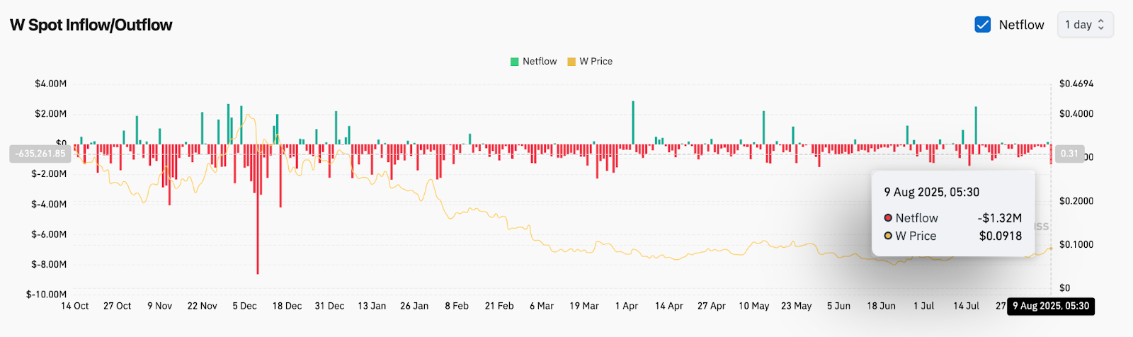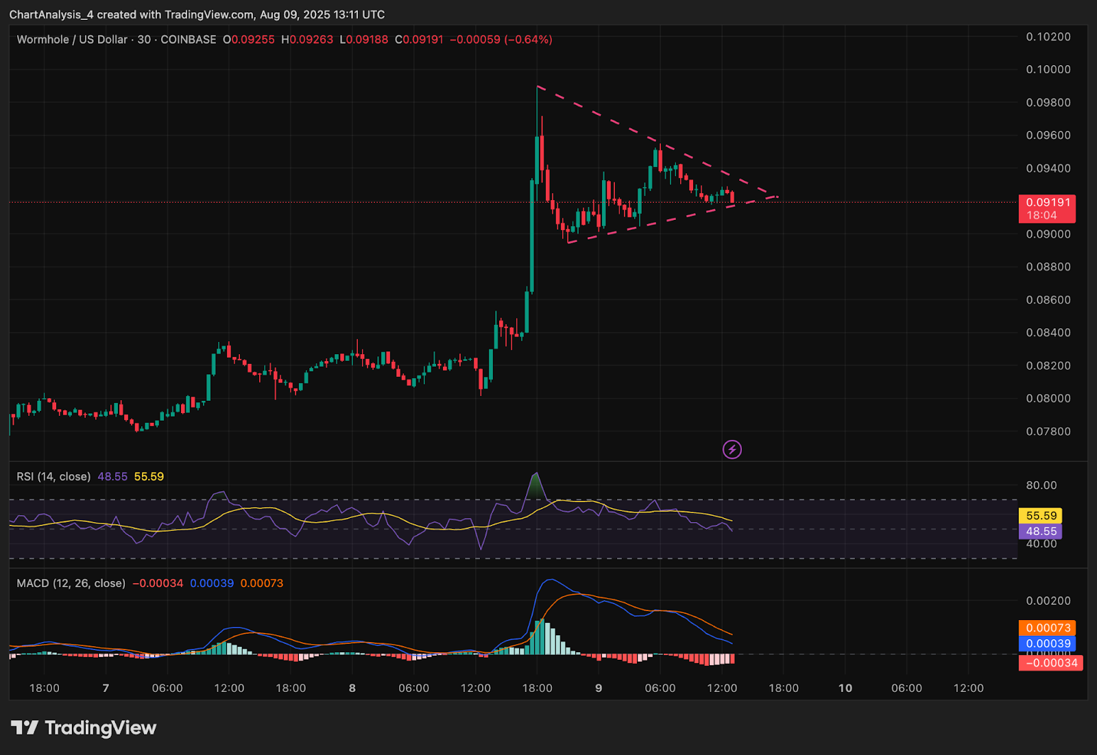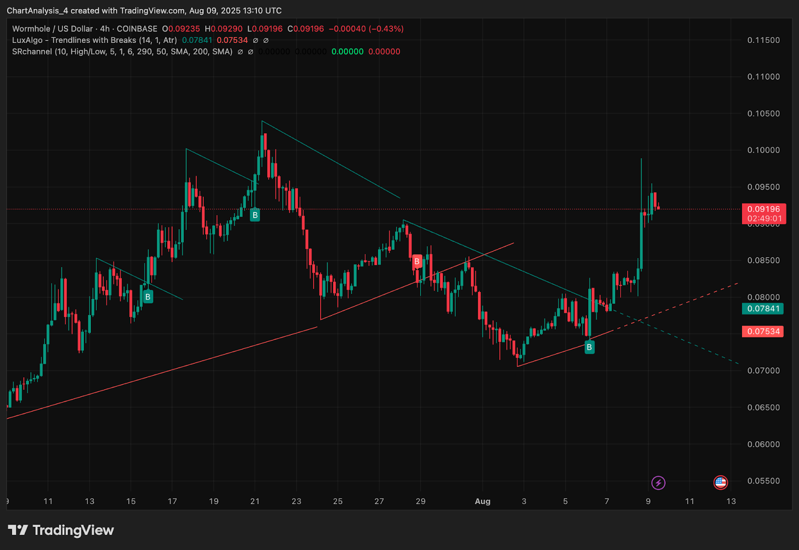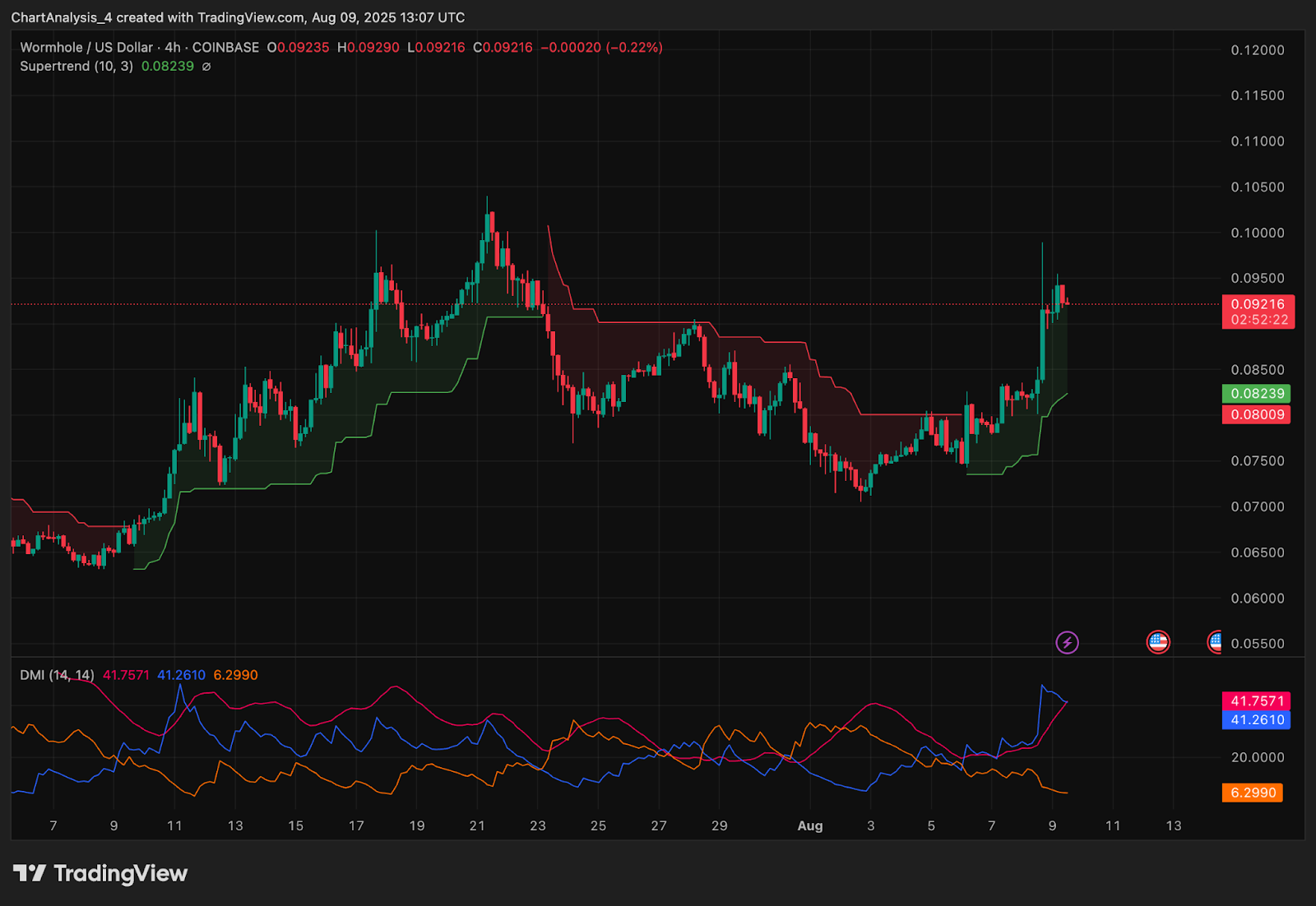 На 4-часовом графике видно, что цена Wormhole пробила зону сопротивления $0,085–$0,088, что привело к быстрому росту до $0,095, прежде чем продавцы сдержали рост. Индикатор Supertrend перешёл на бычий тренд с базой тренда вблизи $0,082, подтверждая недавнее изменение структуры.
